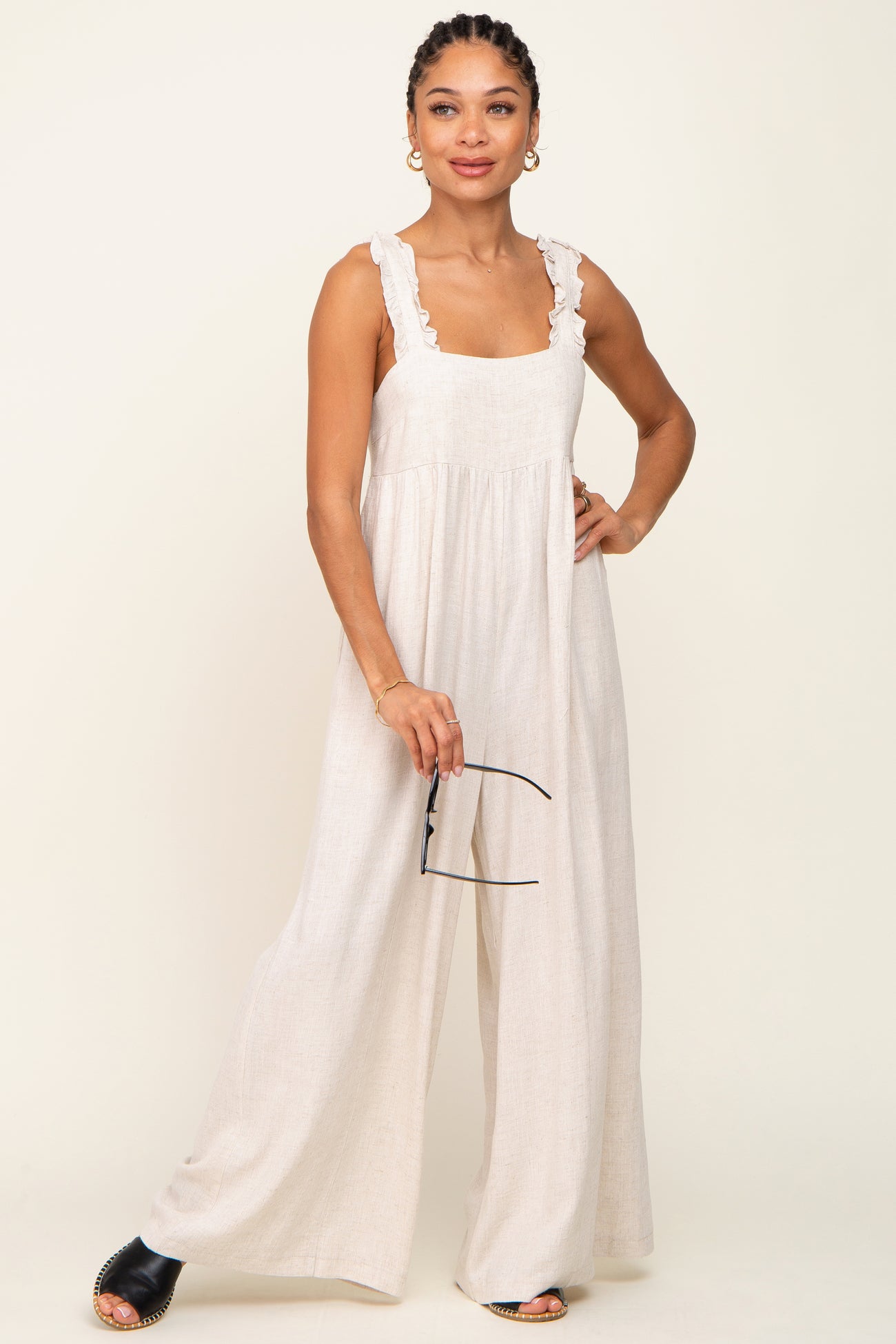Details A linen jumpsuit with ruffle trim straps, a squared neckline, side pockets, and a back tie. Straps can be adjusted. Content + Care