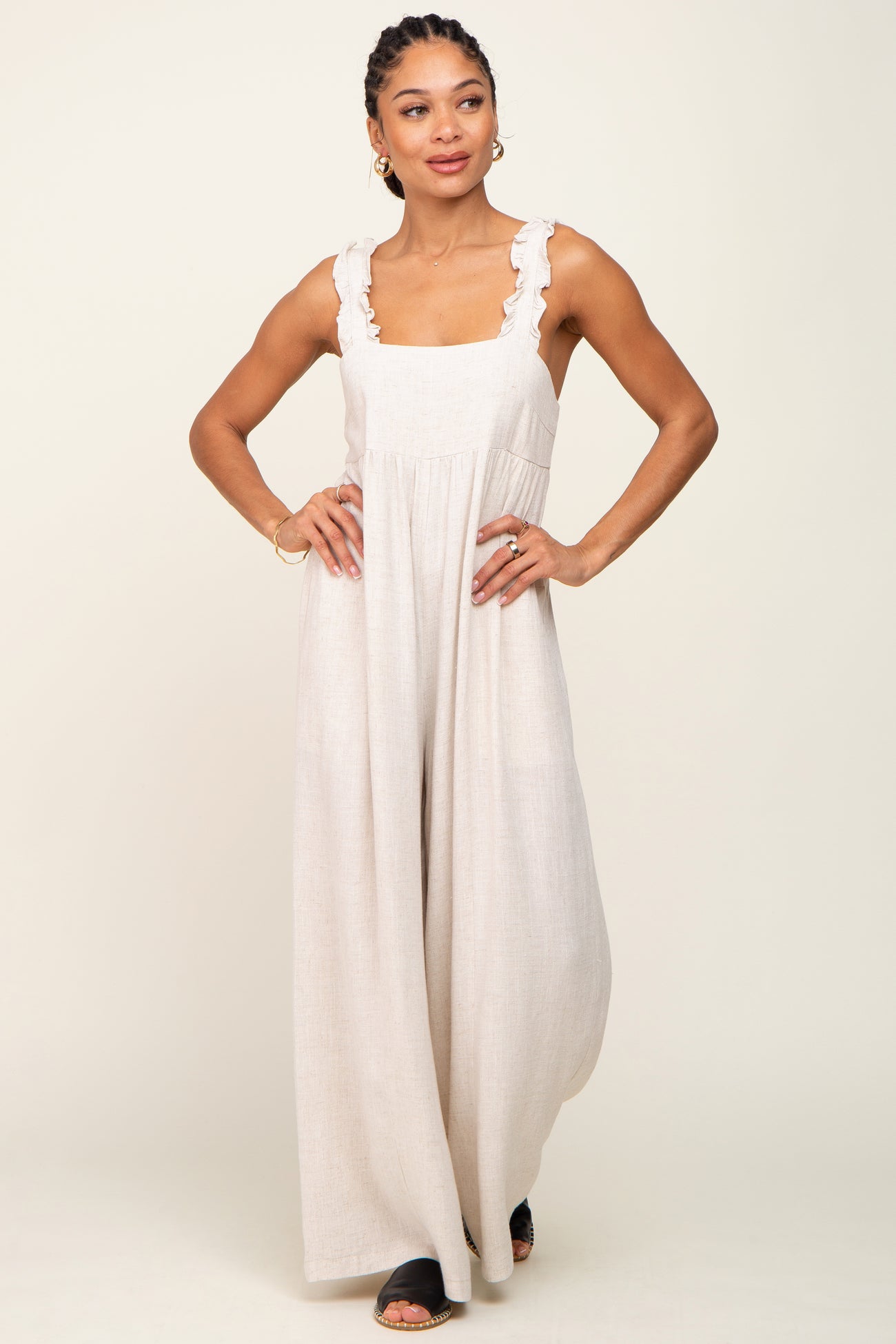 Beige Ruffle Trim Back Tie Jumpsuit
