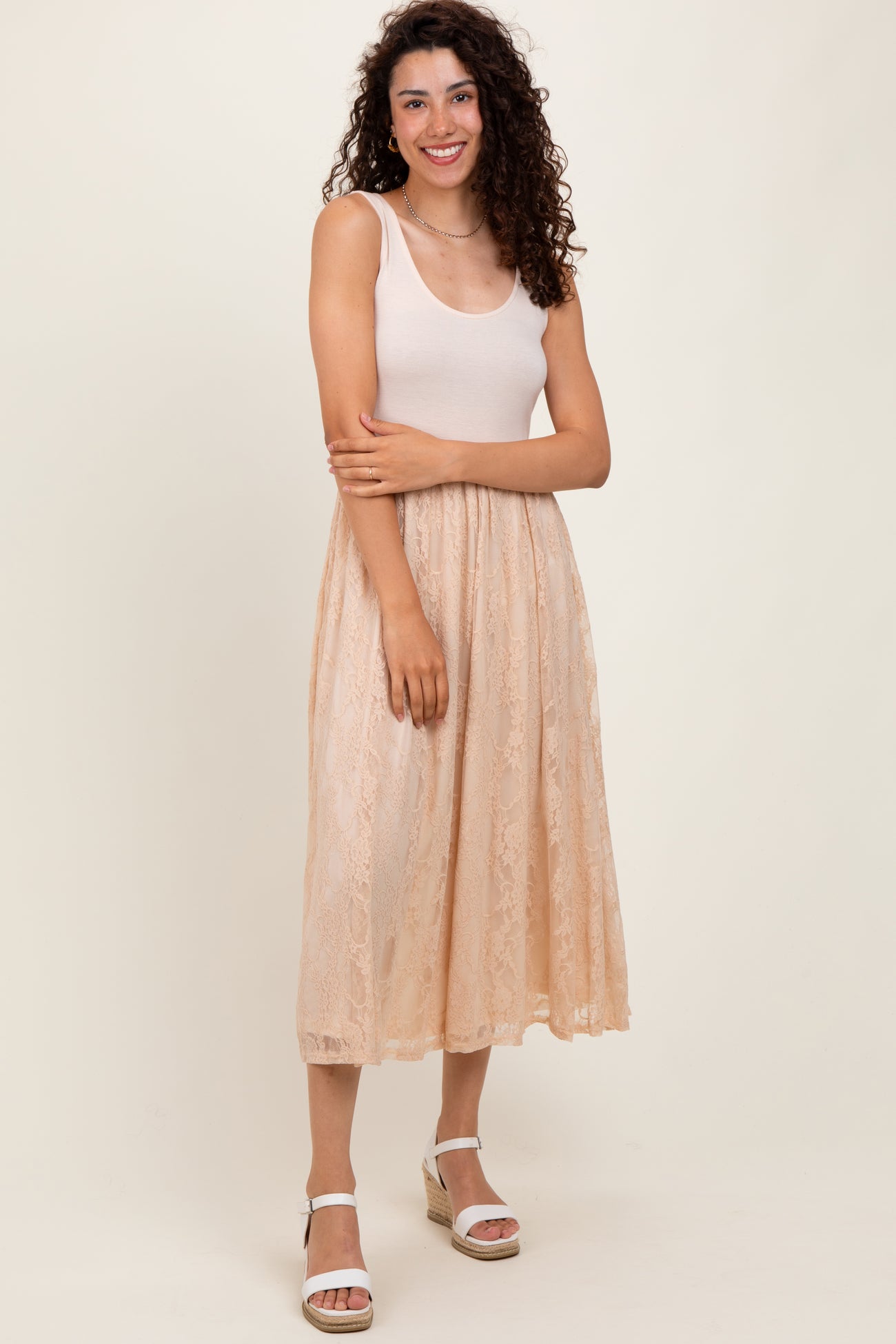 Beige Solid Tank Top Lace Skirt Midi Dress