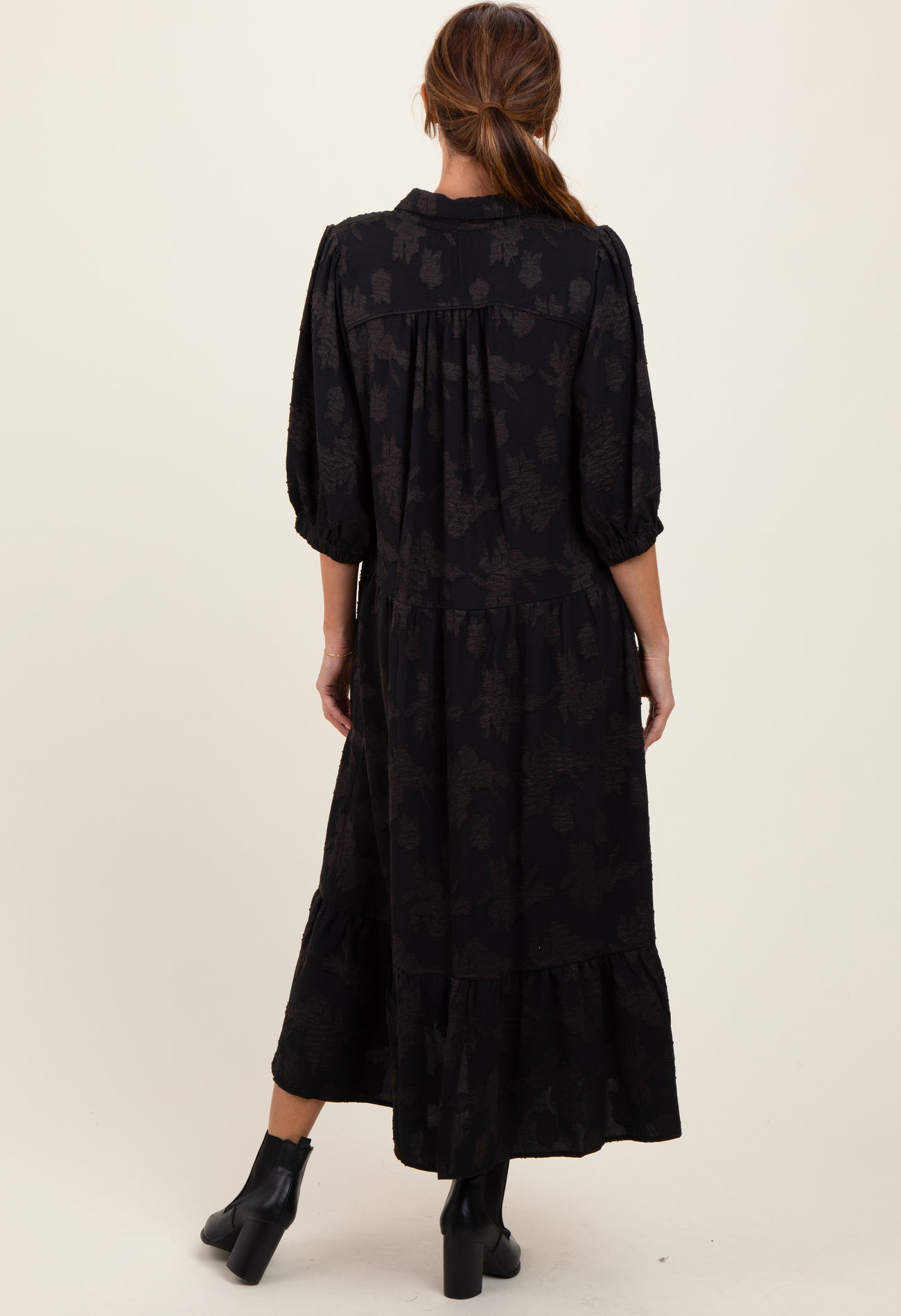 Black Floral Applique Collared Midi Dress