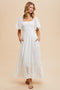 A floral print organza maternity plus size midi dress featuring a square neckline, short puff sleeves, a smocked back, an empire waist and an A-line skirt with a ruffle hem. Double lined.