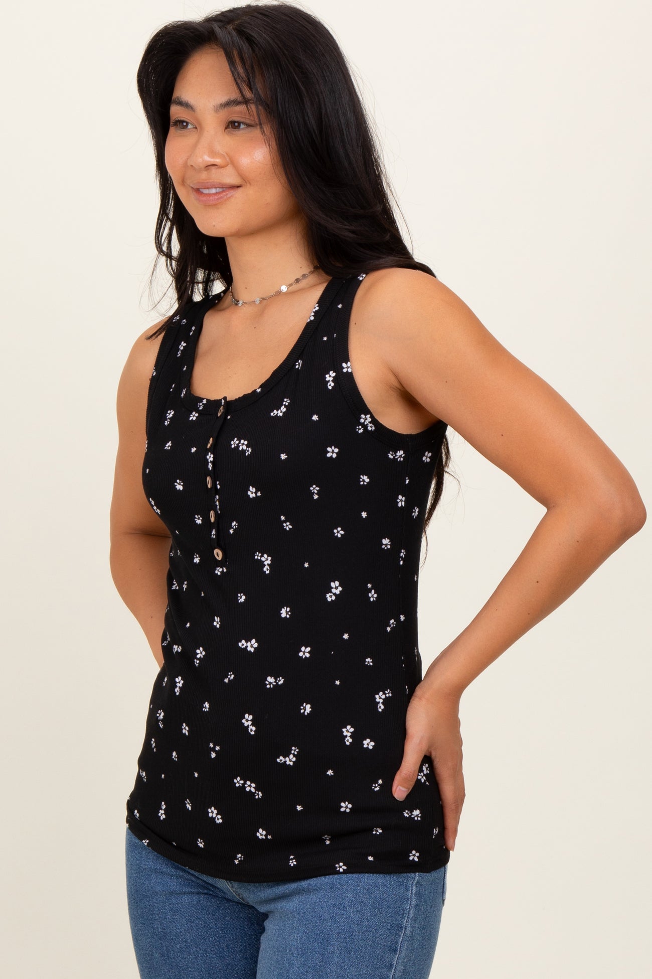 Black Floral Print Ribbed Henley Sleeveless Top