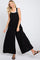 A solid jumpsuit with a large front pocket detail, adjustable button straps, and side pockets.