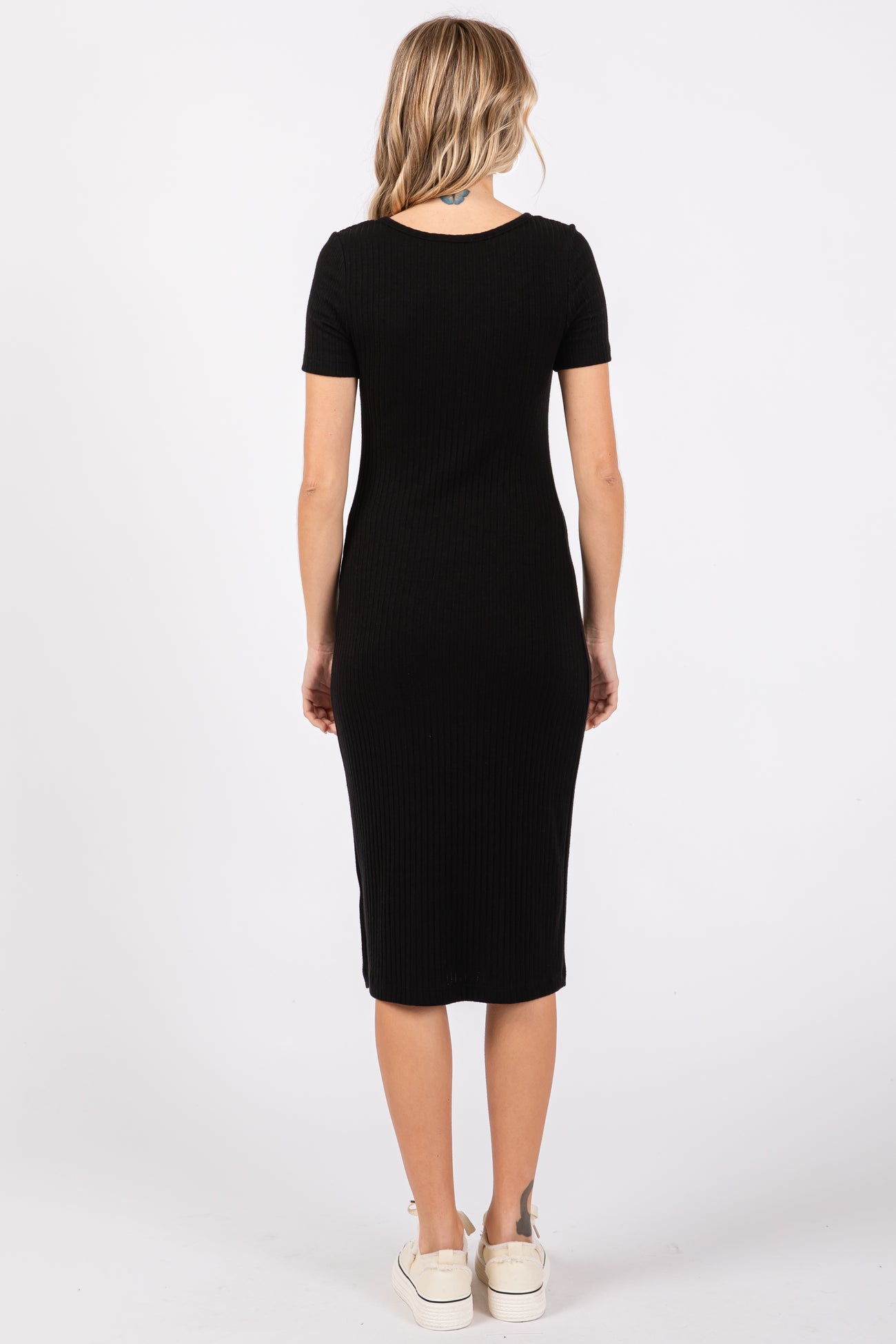 A ribbed knit midi dress featuring a rounded neckline, short sleeves and a front button down accent.