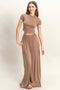 A solid lightweight ribbed sleeveless midi dress with a mock neckline.