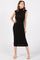 Details A solid fitted midi dress with side ruching and gathered high neckline. Content + Care