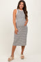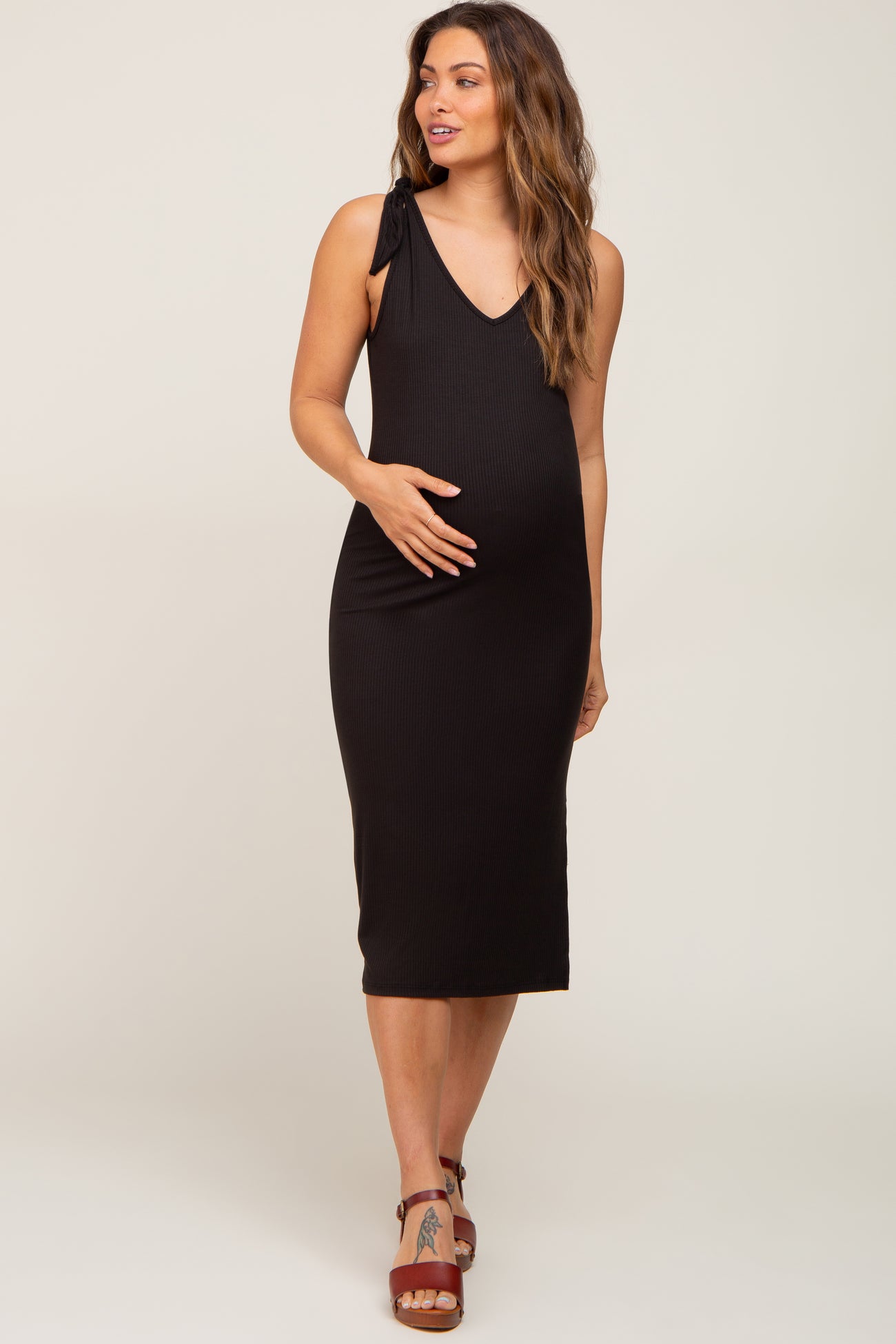 Black Ribbed Shoulder Tie Maternity Midi Dress