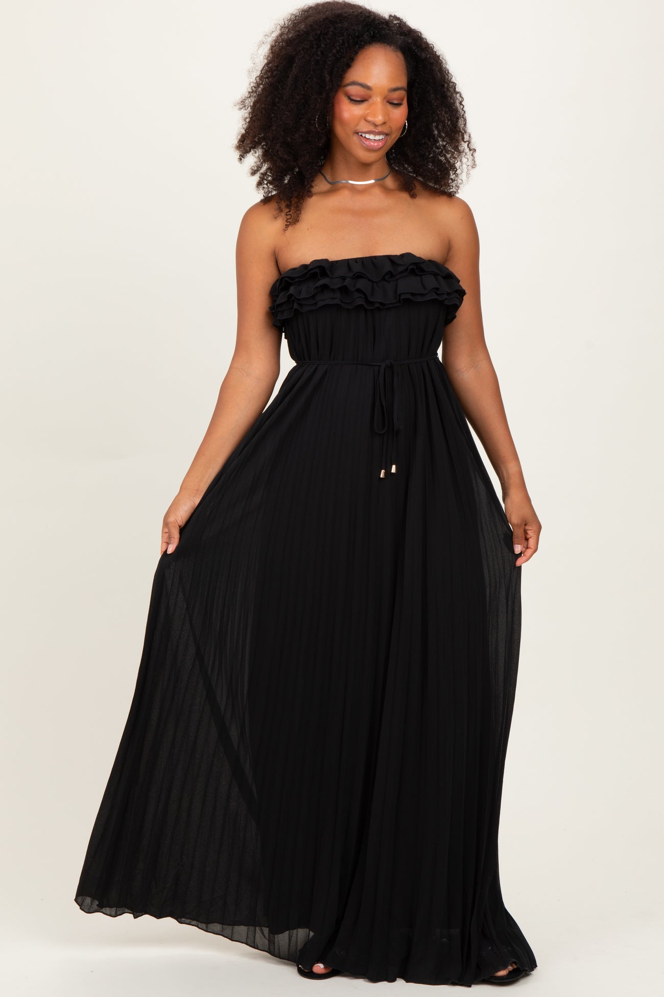 Black Ruffled Chest Pleated Maxi Dress With Self Tie