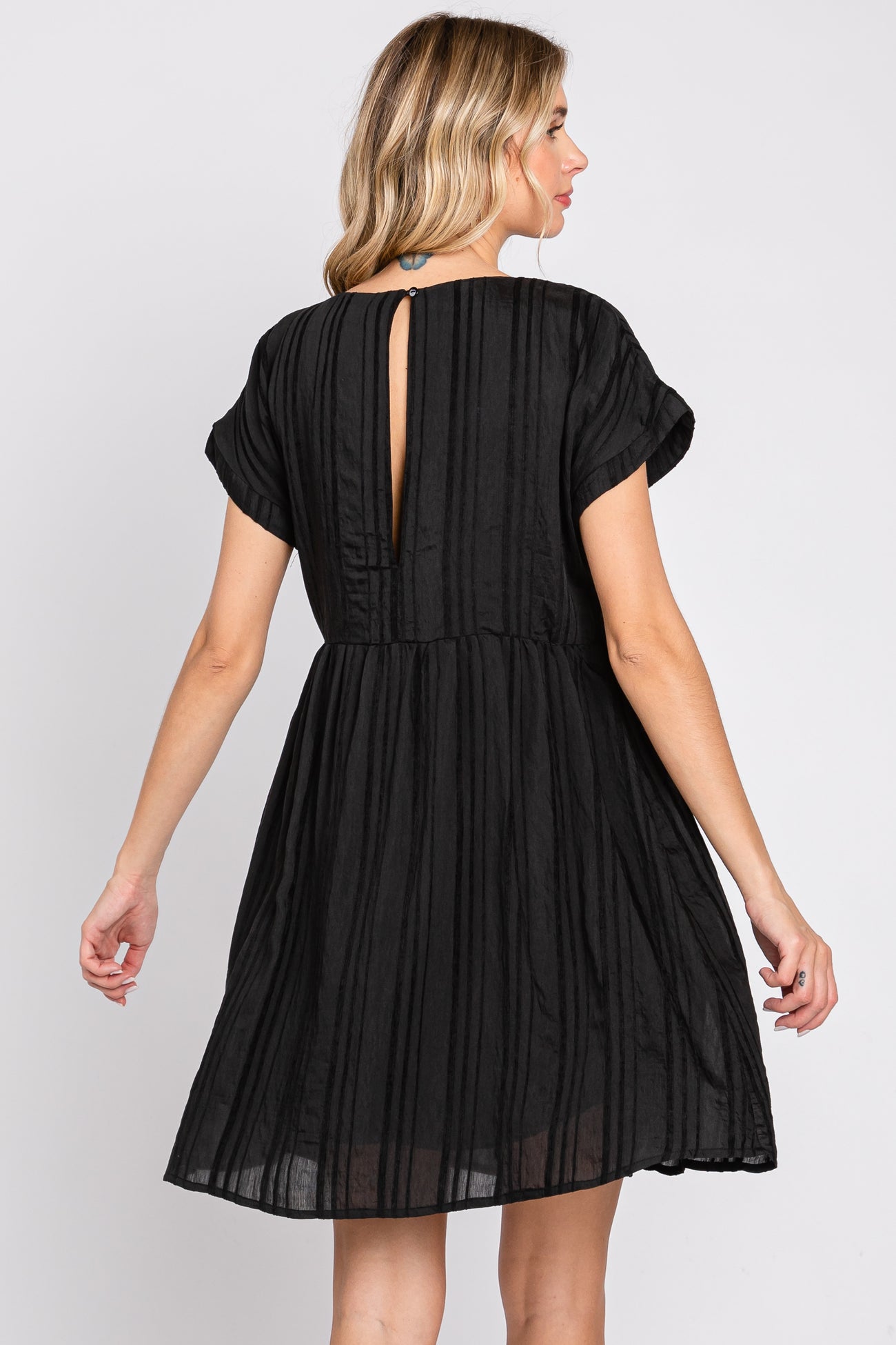 Details A striped dress featuring short sleeves, side pockets, a v-neckline and a back keyhole cutout with a button closure. Double lined. Content + Care