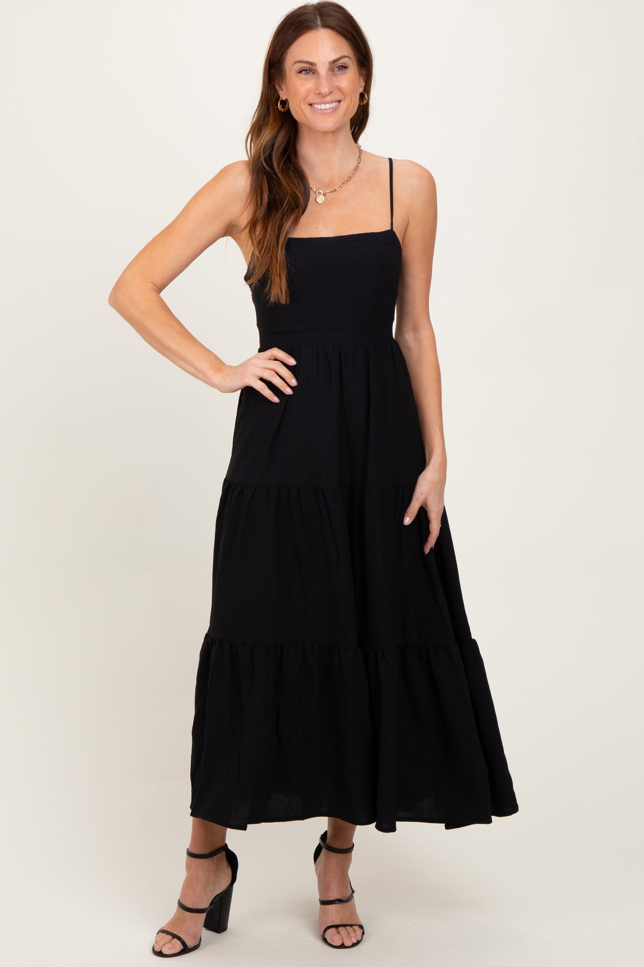Elevate your wardrobe with our Black Tiered Cutout Tie Back Midi Dress—where effortless elegance meets modern charm. Crafted with lightweight fabric, this dress features a flattering tiered skirt that adds flowy movement and dimension. The sleek, square neckline and delicate spaghetti straps highlight your shoulders, while the subtle cutout and tie-back details at the waist bring a touch of playful sophistication. Perfect for daytime outings or evening events, this versatile midi dress pairs beautifully with heels or sandals. Embrace timeless style and comfort in one stunning piece. Available in multiple sizes.