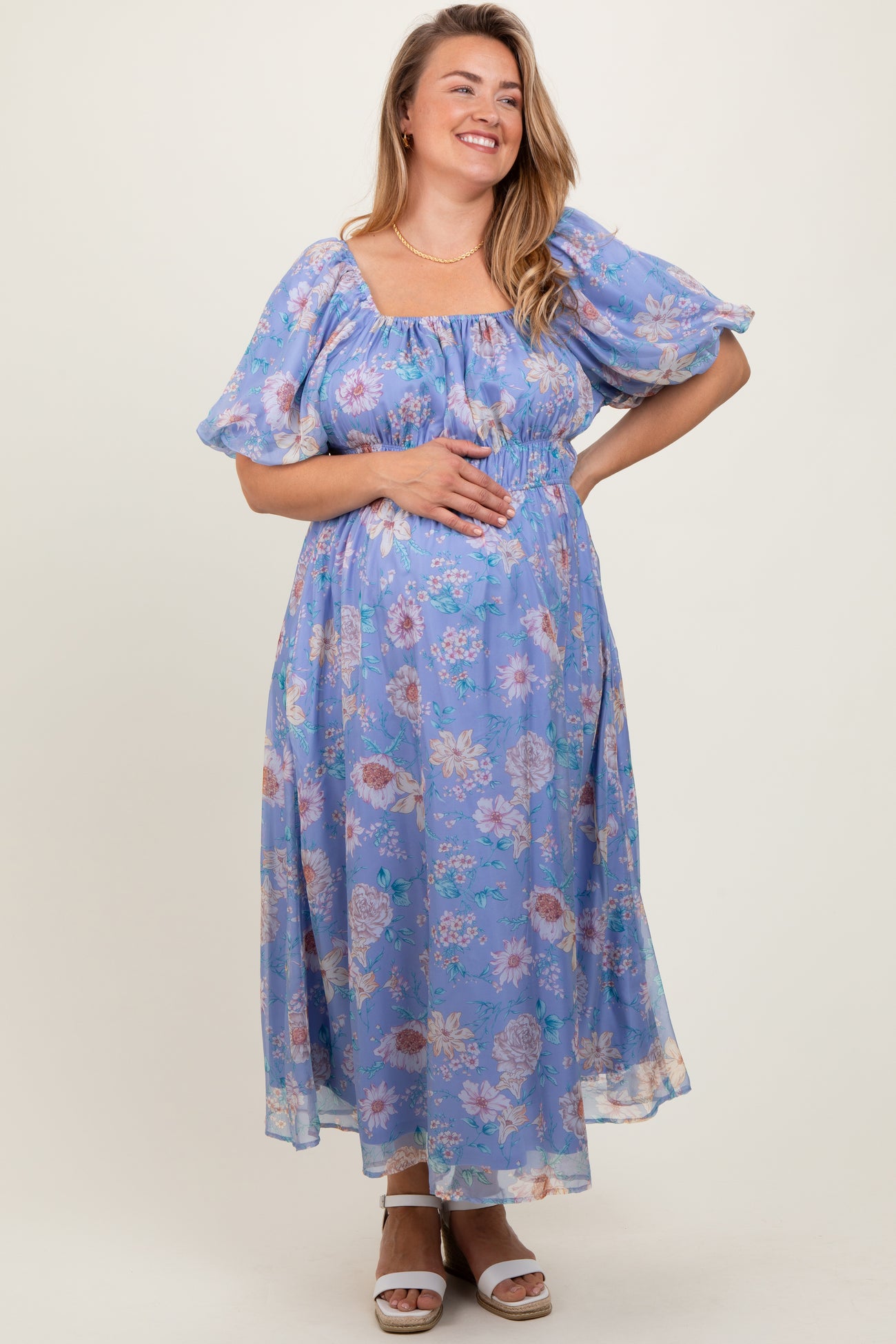 Blue Floral Chiffon Puff Sleeve Maternity Plus Midi Dress