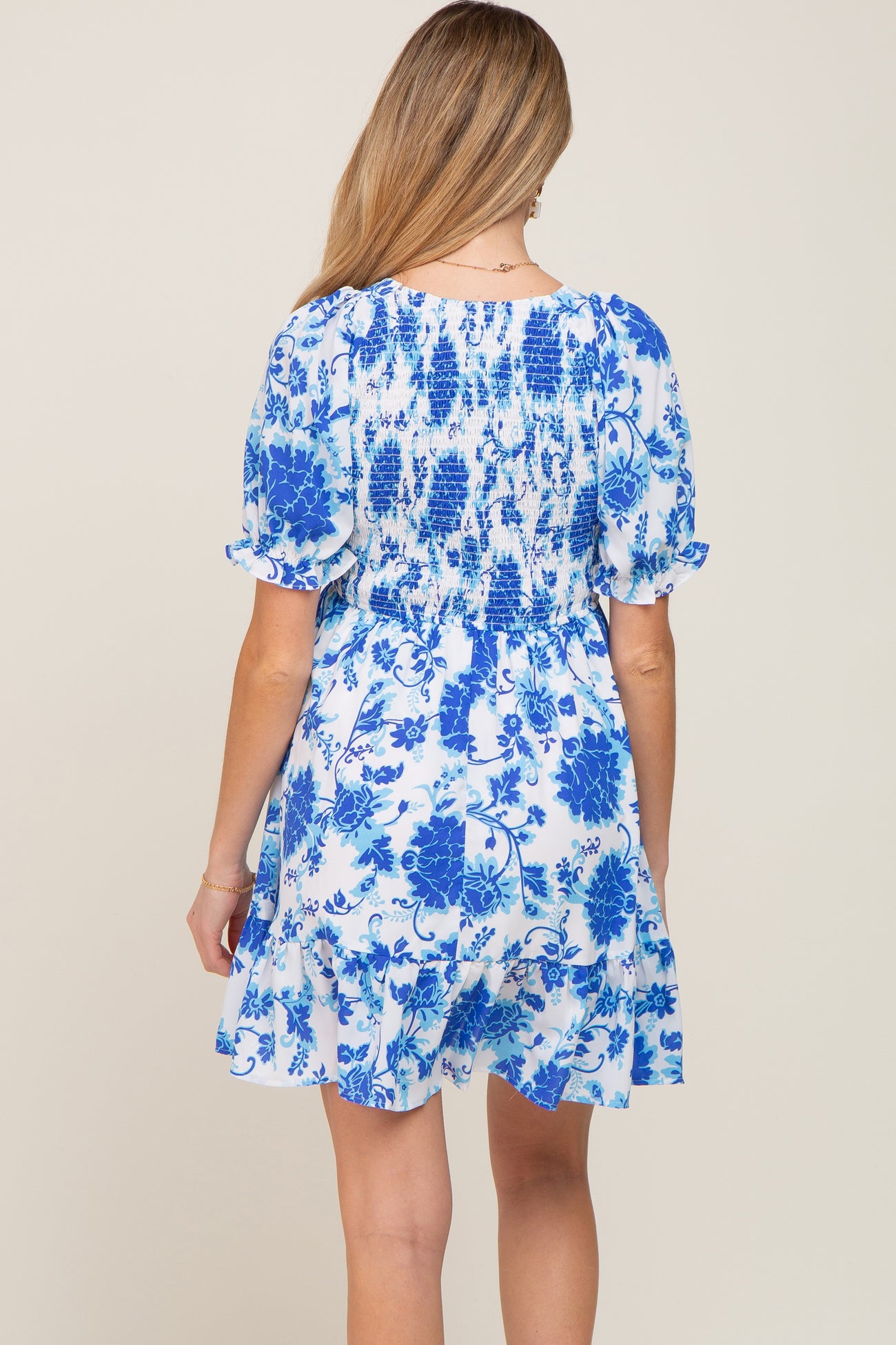 Blue Floral Smocked Puff Sleeve Maternity Dress