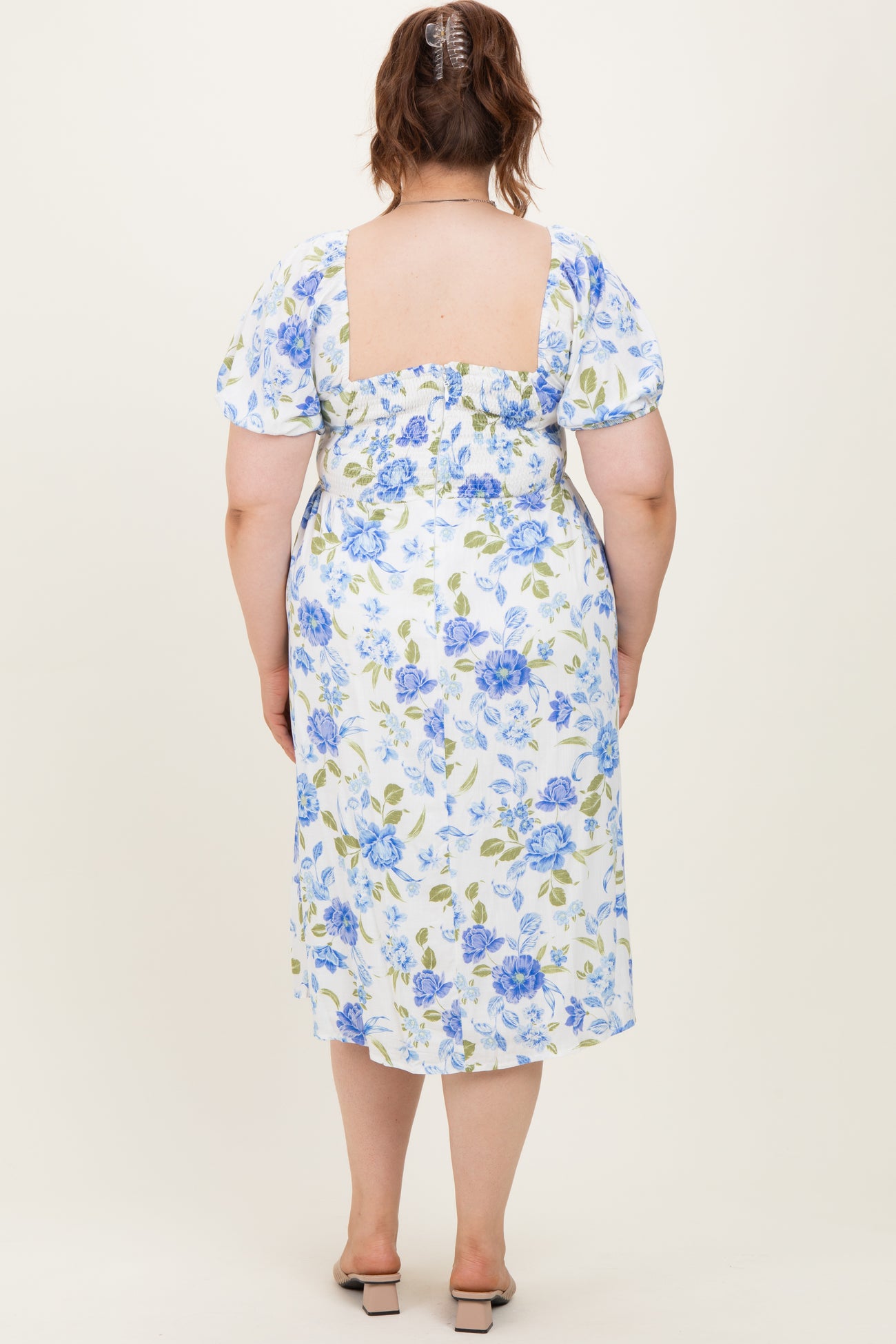 Blue Floral Sweetheart Neckline Puff Sleeve Maternity Plus Midi Dress