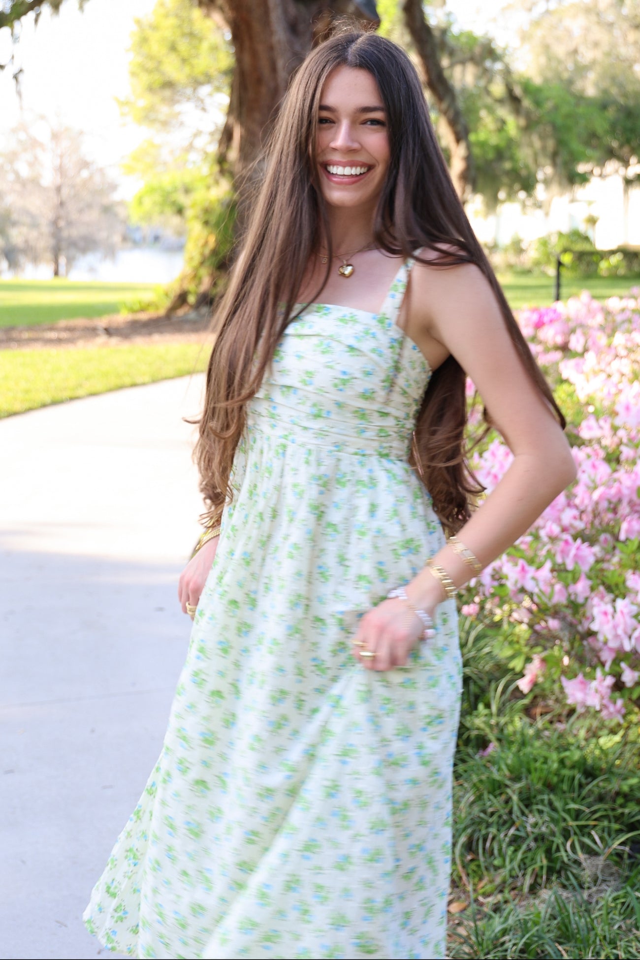 A floral print midi dress featuring a square neckline, adjustable straps, a smocked back, an A-line skirt and double lining.