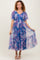 A leaf print midi dress with a v-neckline, a smocked top, short semi sheer short sleeves, and a gathered bottom tier. Body is lined.