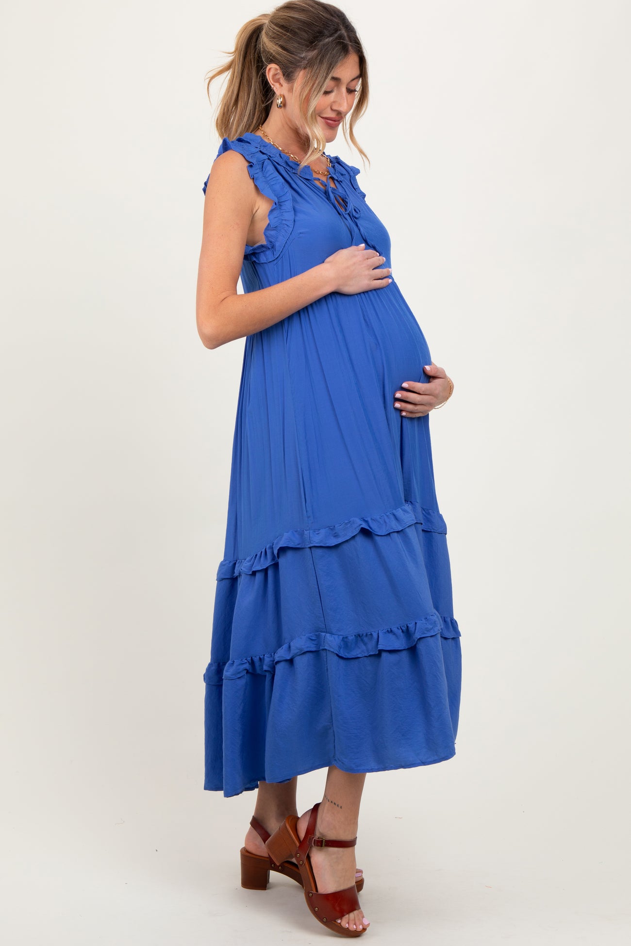 Blue Ruffle Accent Tiered Front Tie Maternity Midi Dress