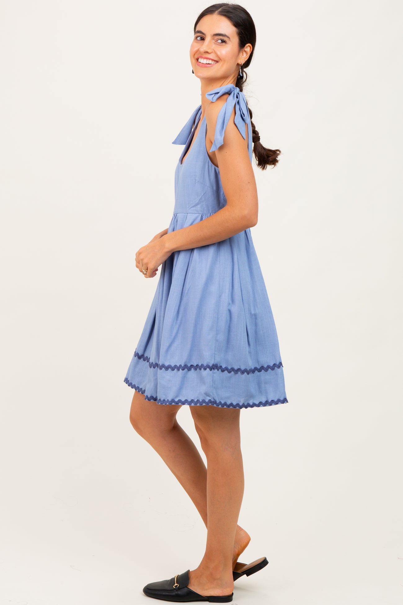 Step into effortless charm with our Blue Shoulder Bow Tie Pleated Mini Dress. This delightful dress features soft pleats that add a feminine flow, while the shoulder bow ties create a playful, adjustable fit. Crafted from lightweight, breathable fabric in a soothing pastel blue, it’s perfect for sunny days and casual outings. The mini length and subtle scalloped trim along the hem bring a sweet, flirty touch to your wardrobe. Pair it with sandals or sneakers for a chic, laid-back look that’s both comfortable and stylish. A must-have staple for your spring and summer collection!