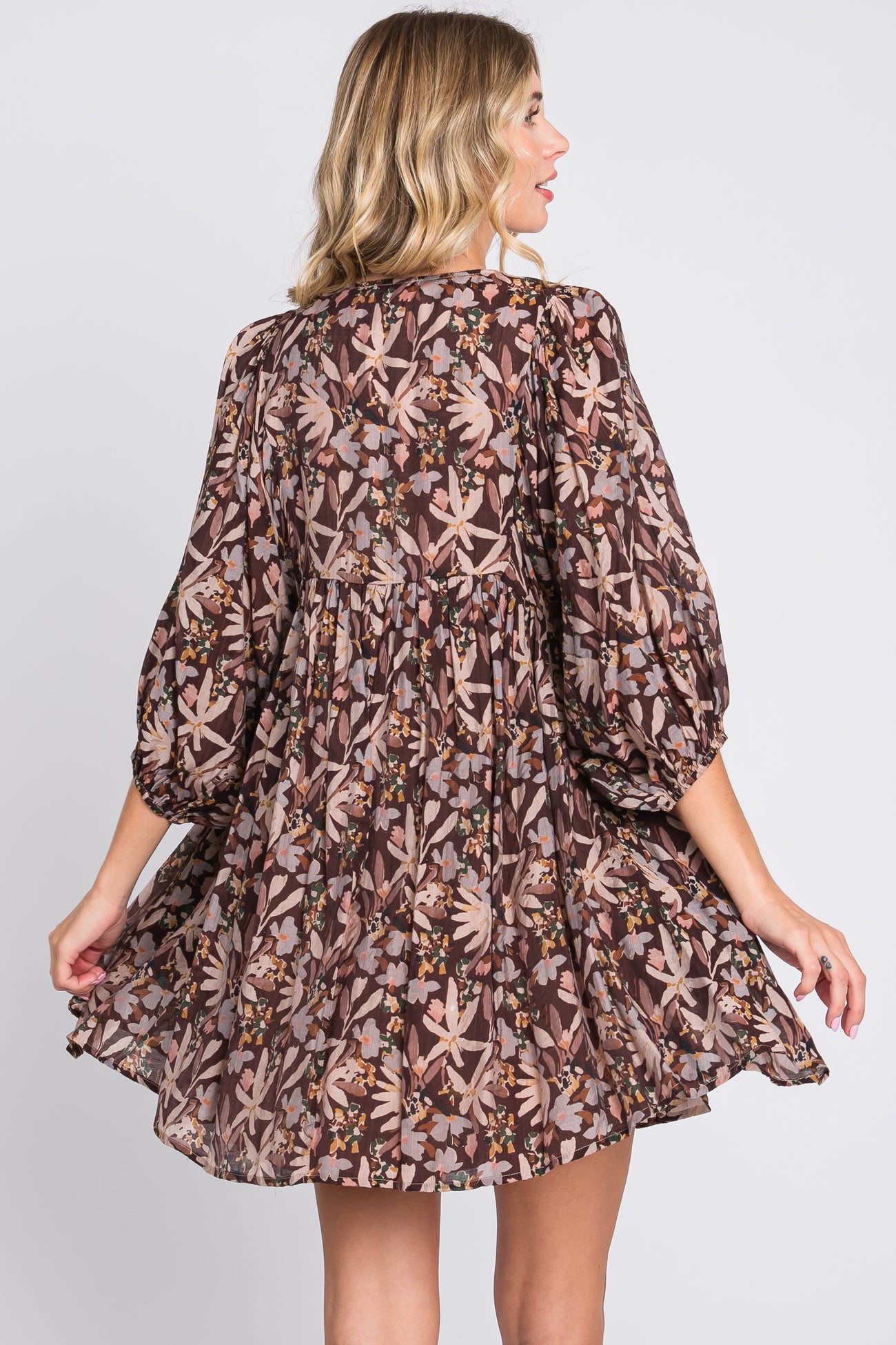 Brown Floral 3/4 Sleeve Dress