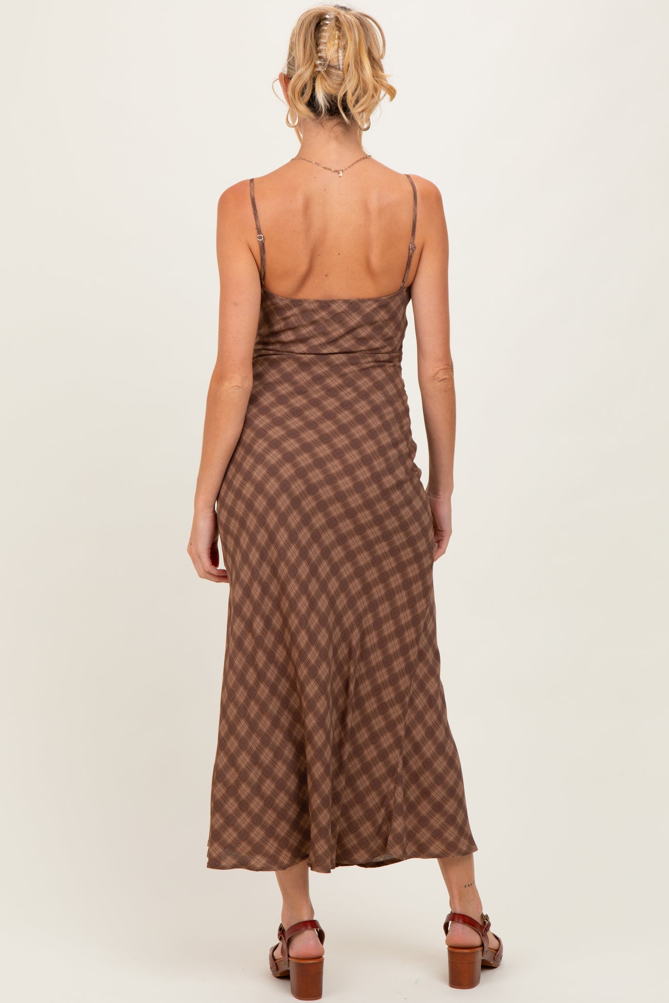 Brown Plaid Sleeveless Maternity Maxi Dress