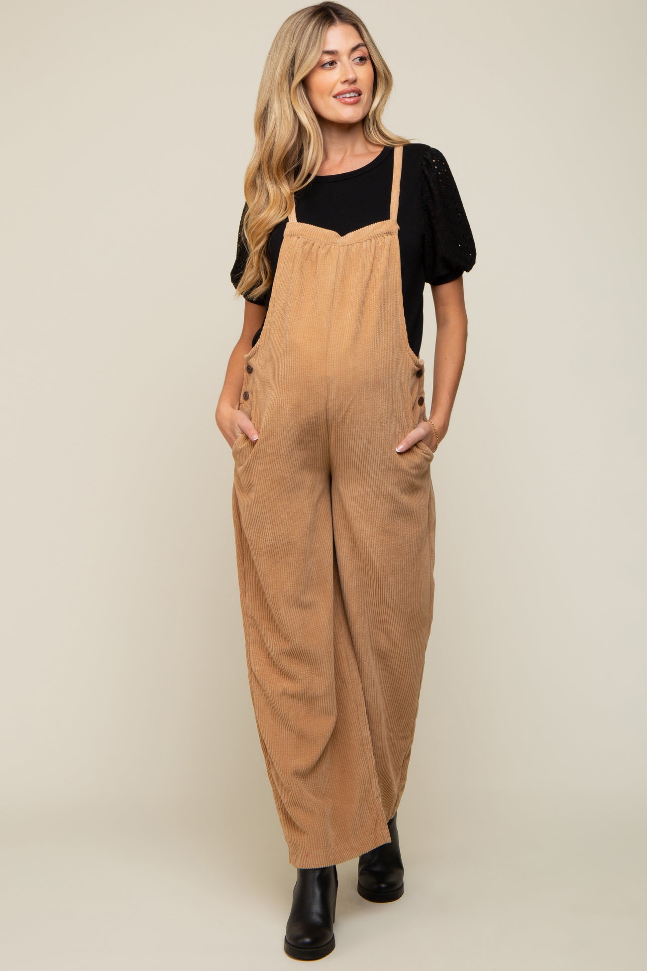 Details A corduroy maternity overall with adjustable straps, side button closures, side pockets, and wide pant legs. Content + Care