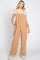 A corduroy overall with adjustable straps, side button closures, side pockets, and wide pant legs.