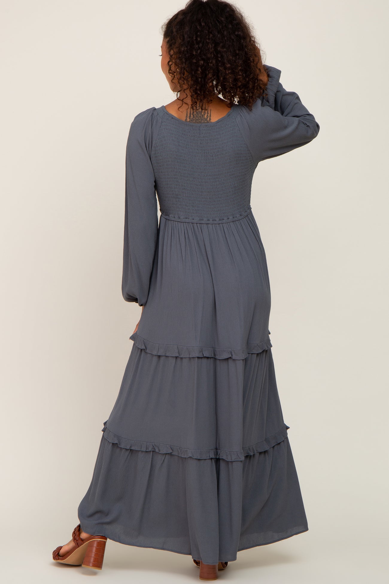 Details A solid midi dress with a v-neckline, smocked bodice, bubble sleeves and tiered skirt. Skirt is double lined. Content + Care
