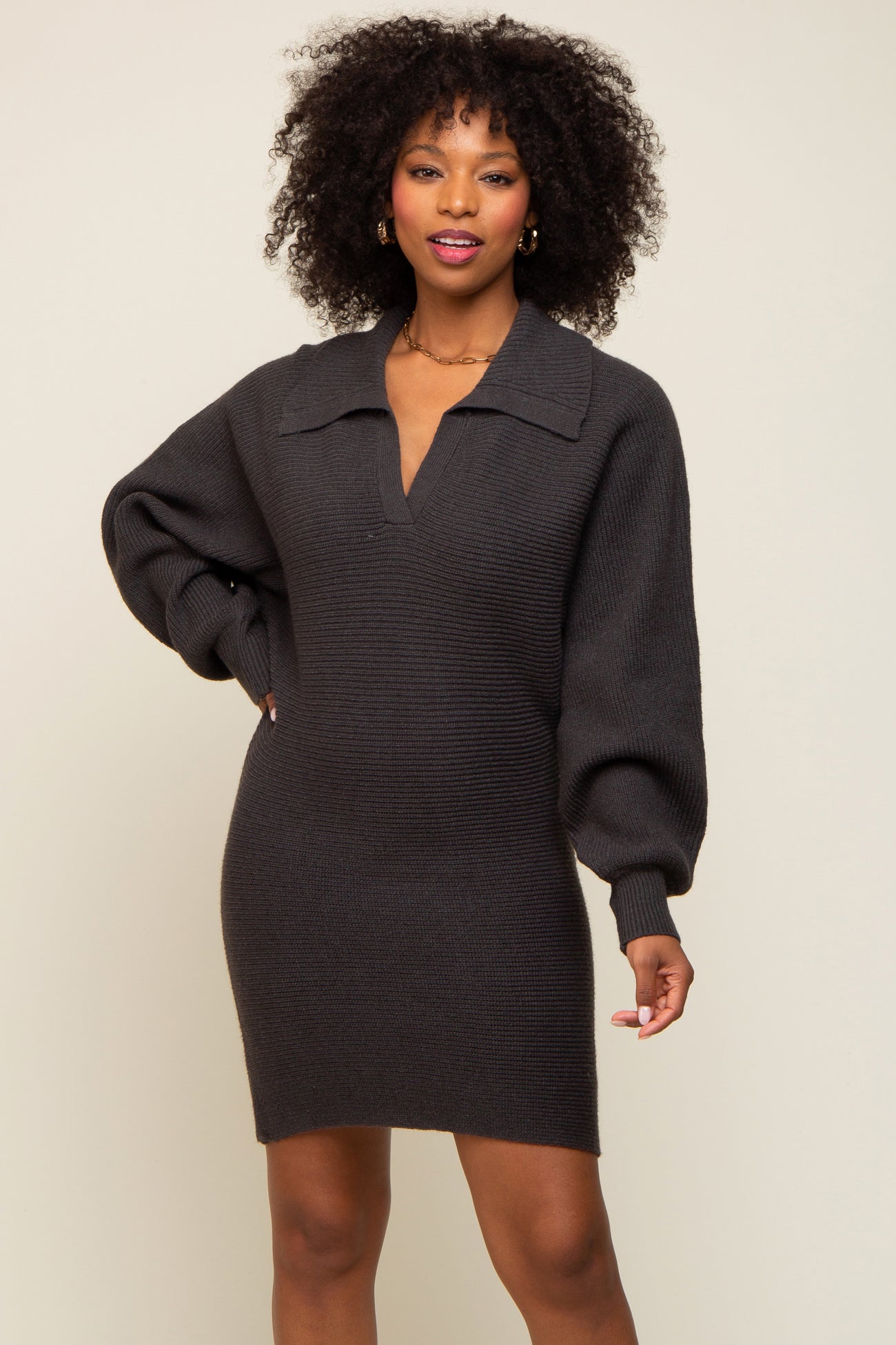 A solid chunky knit fitted sweater mini dress with a collared neckline and oversized sleeves.