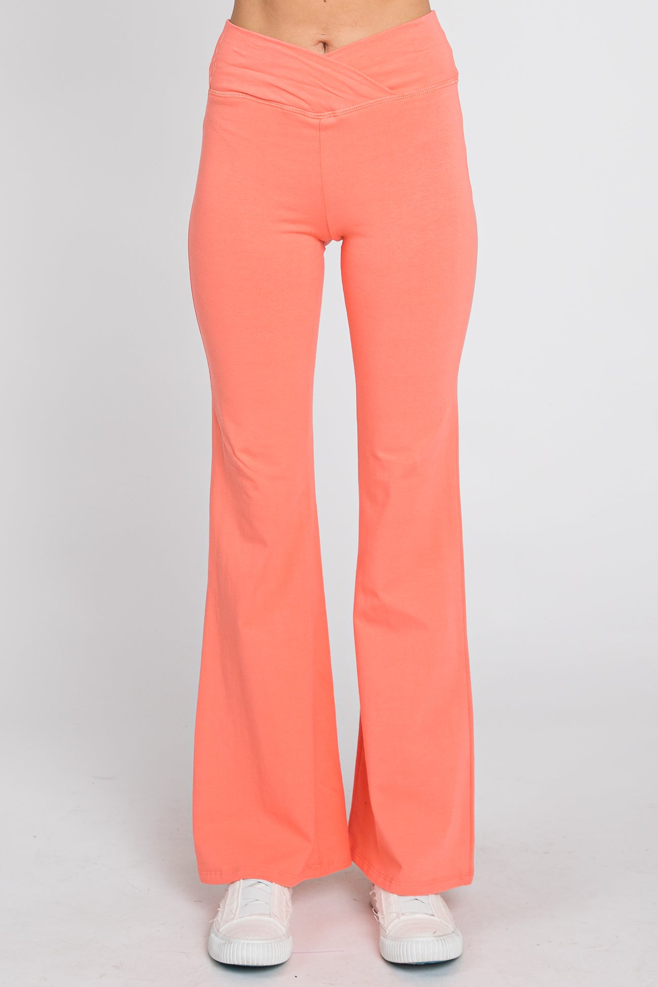 A pair of leggings featuring a layered v-front band and wide pant legs.