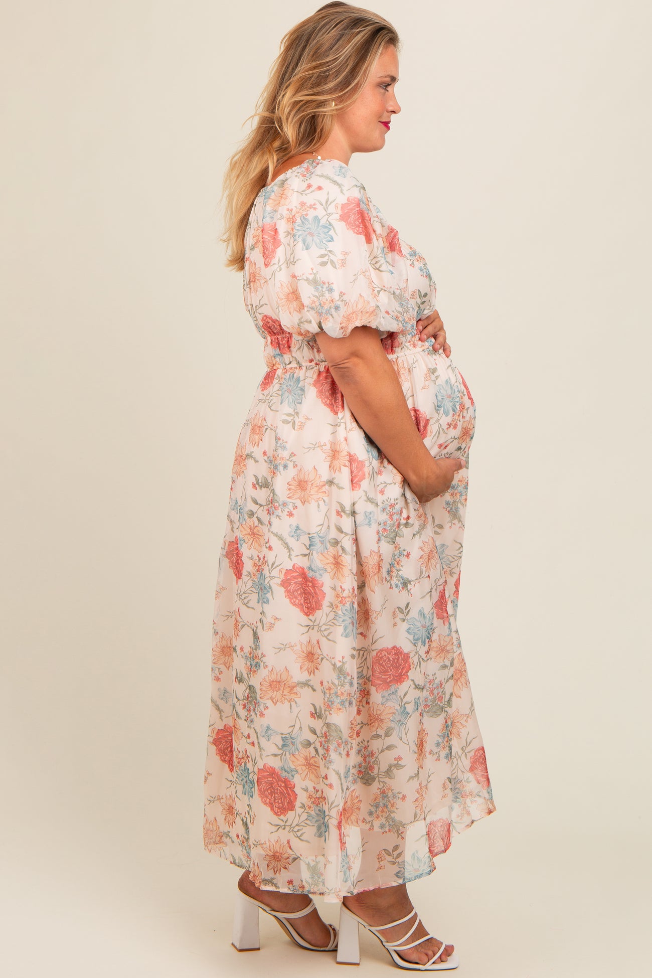 Cream Blue Floral Chiffon Puff Sleeve Maternity Plus Midi Dress