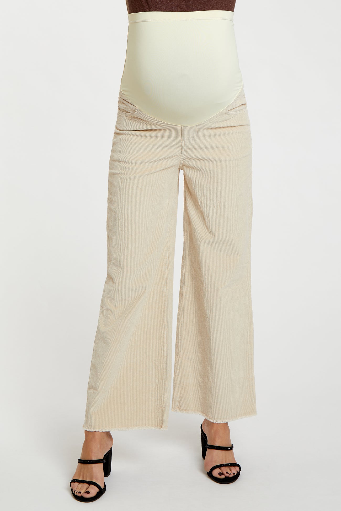 A pair of corduroy maternity pants featuring an elastic belly band, 5 pockets, wide legs, and a raw hem.