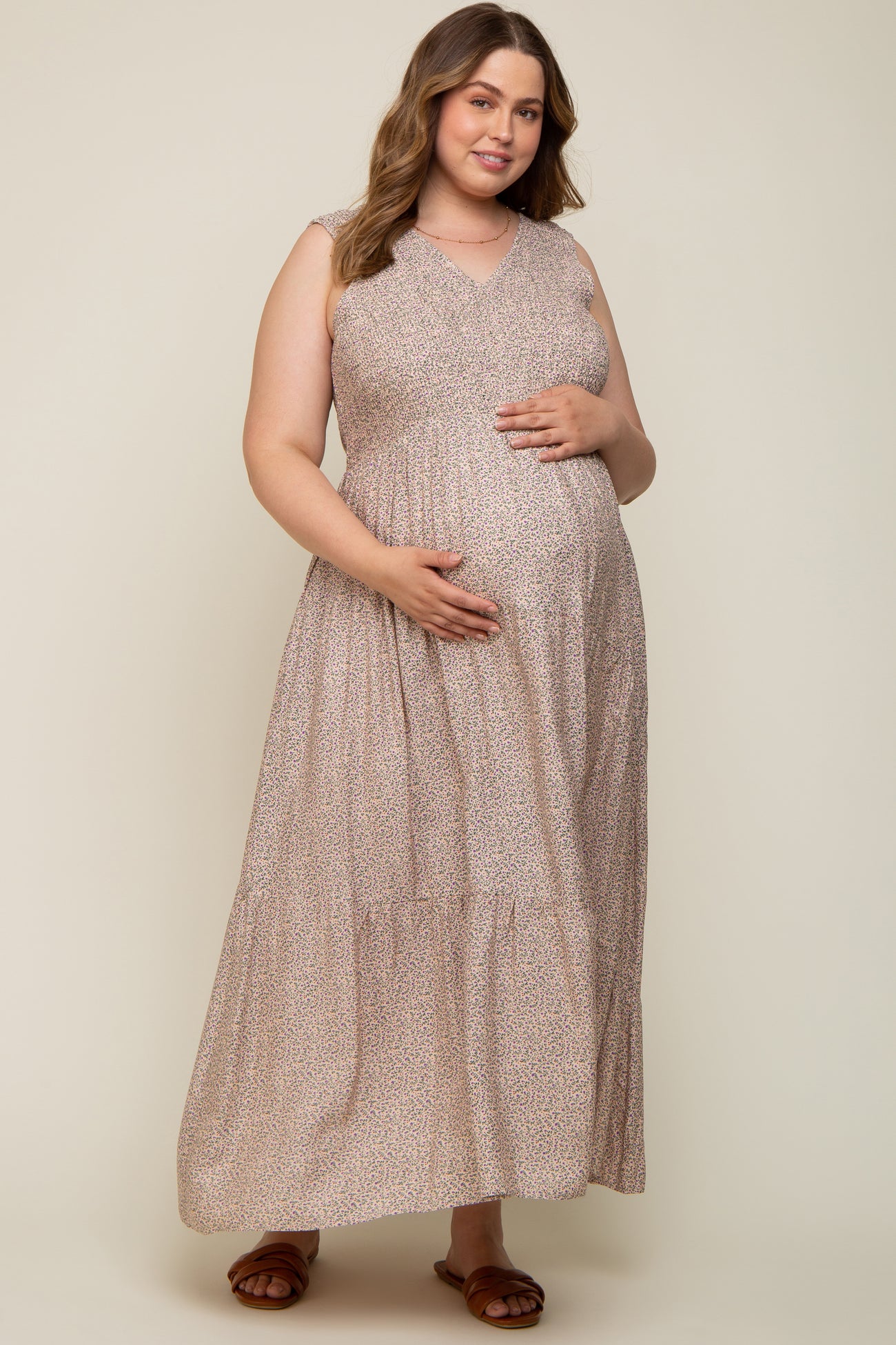 Cream Floral Smocked Sleeveless Back Tie Maternity Plus Maxi Dress