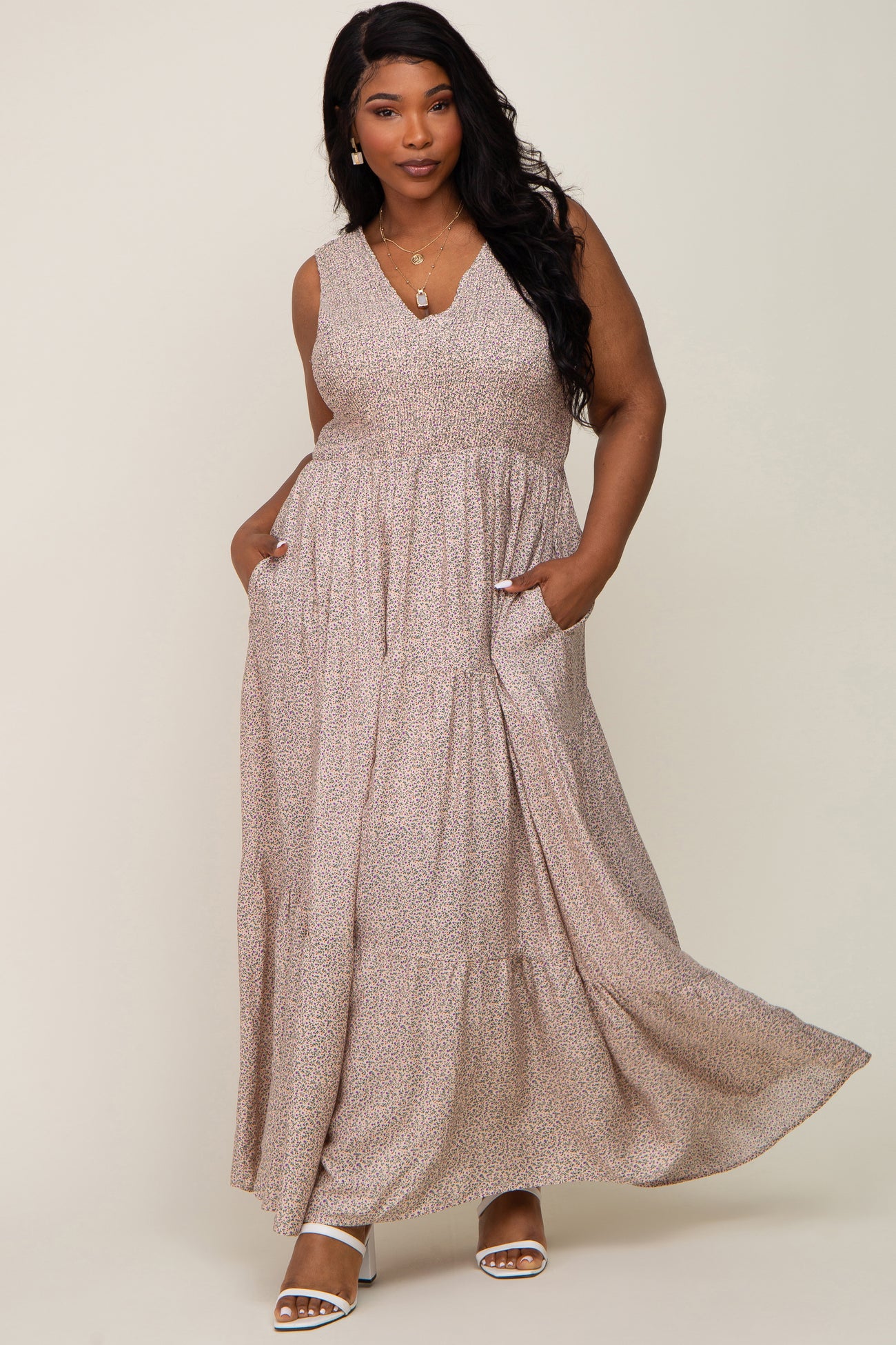 Details A floral print maternity plus size maxi dress. Features a v-neckline, a smocked top, side pockets, a tiered skirt, and a back tie closure. Dress is partially lined. Content + Care