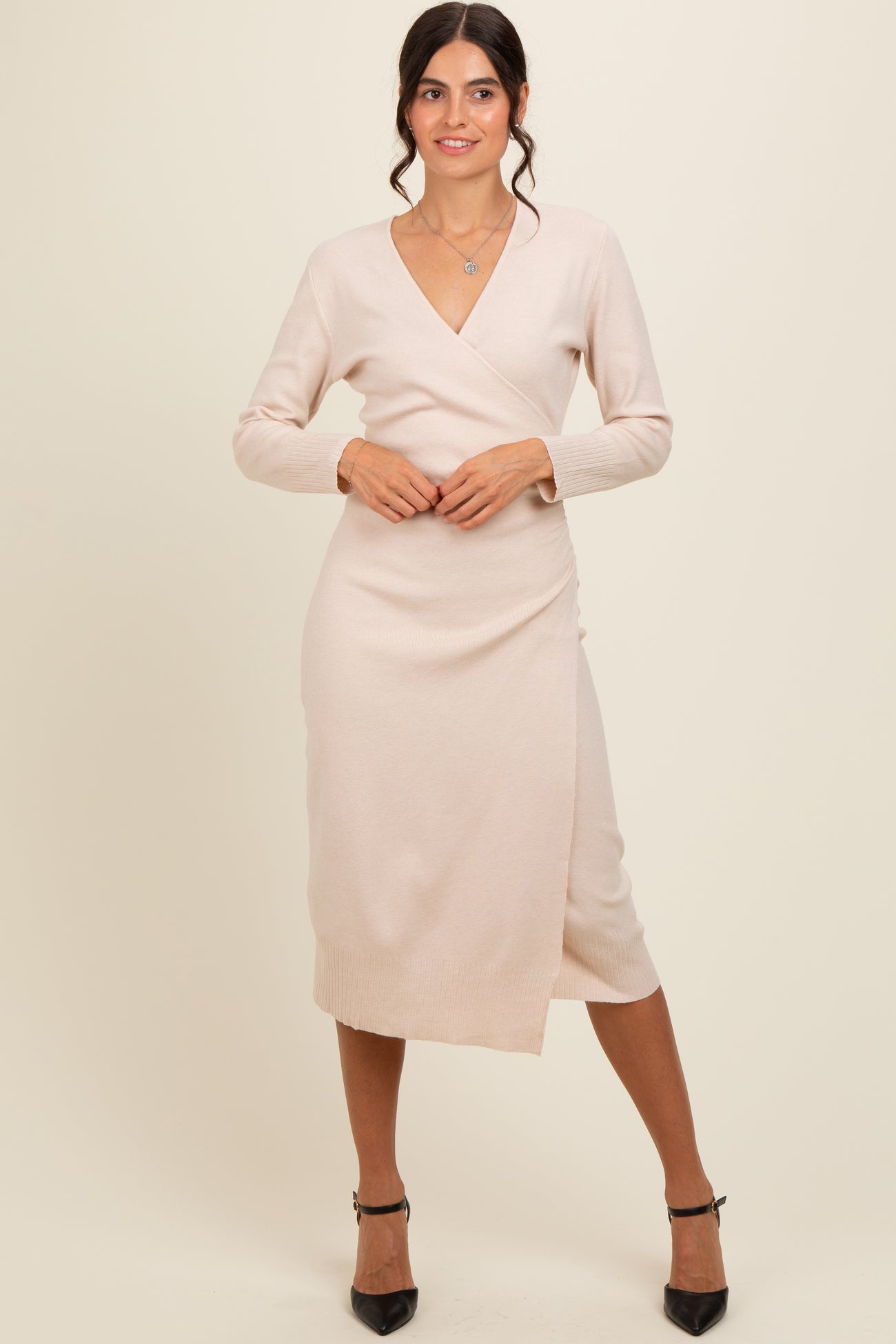 Cream Knit Crossover Ruched Maternity Midi Dress