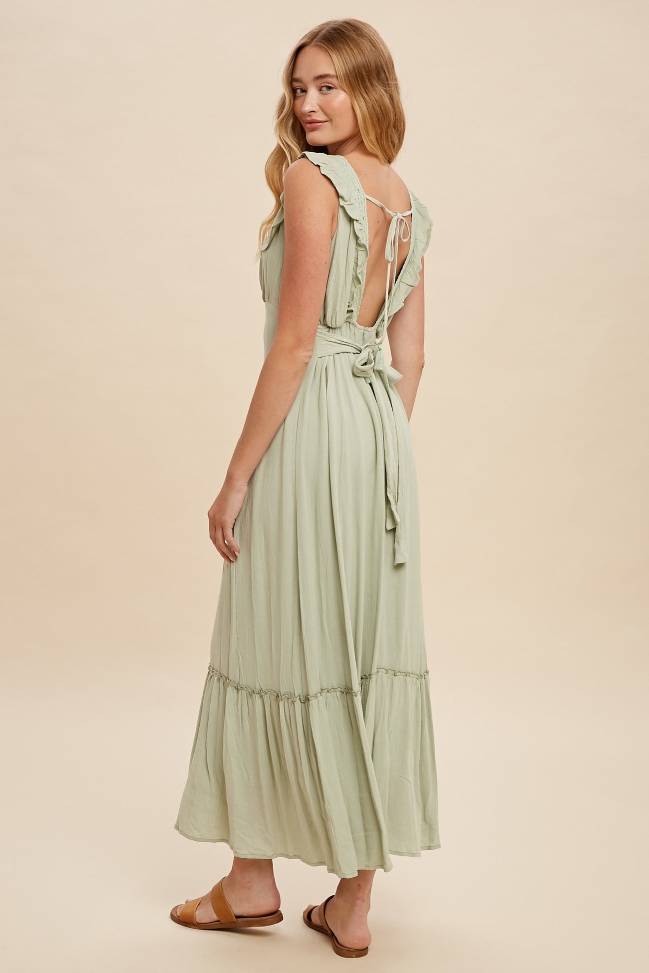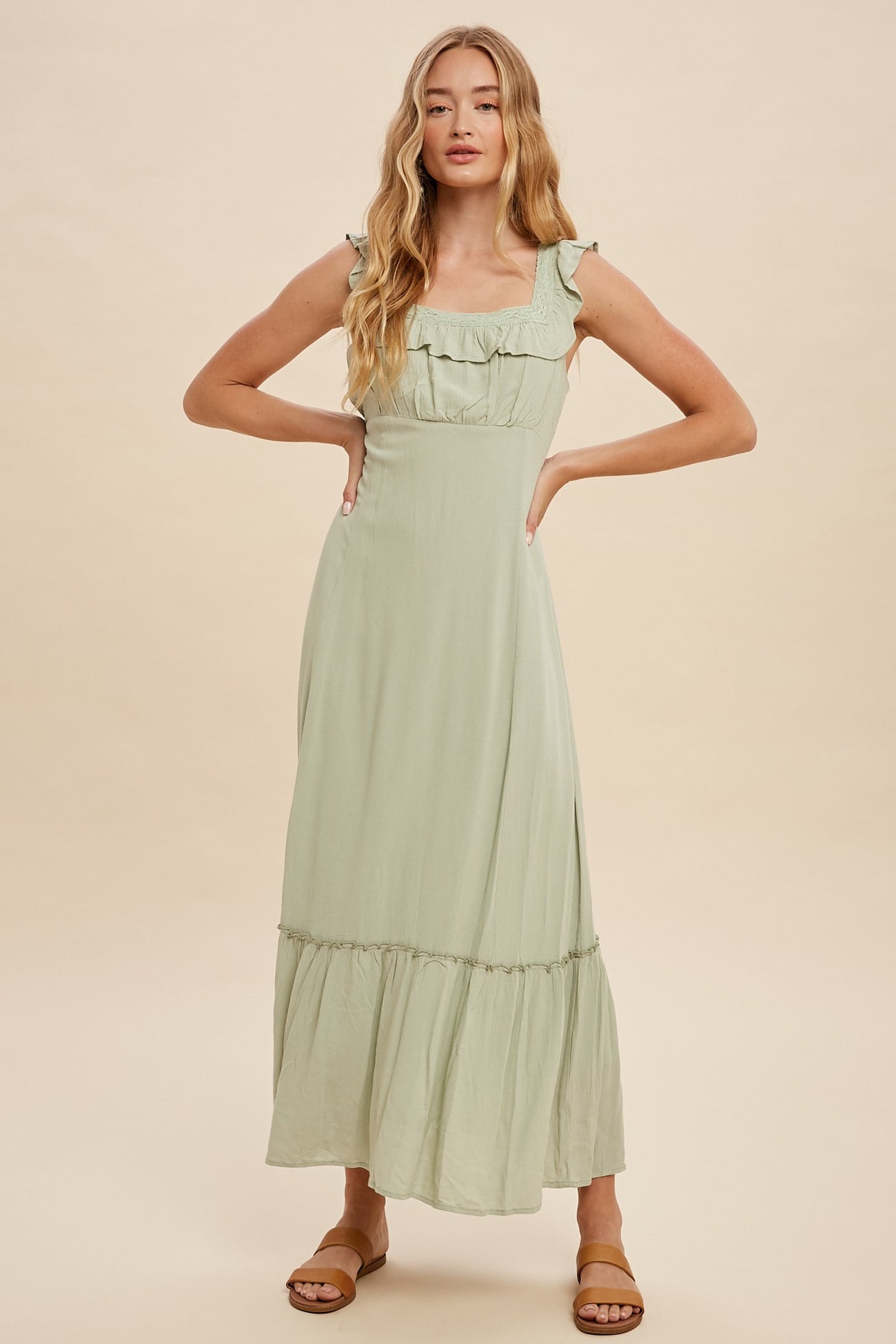 Dusty Sage Sleeveless Lace Accent Open Back Midi Dress