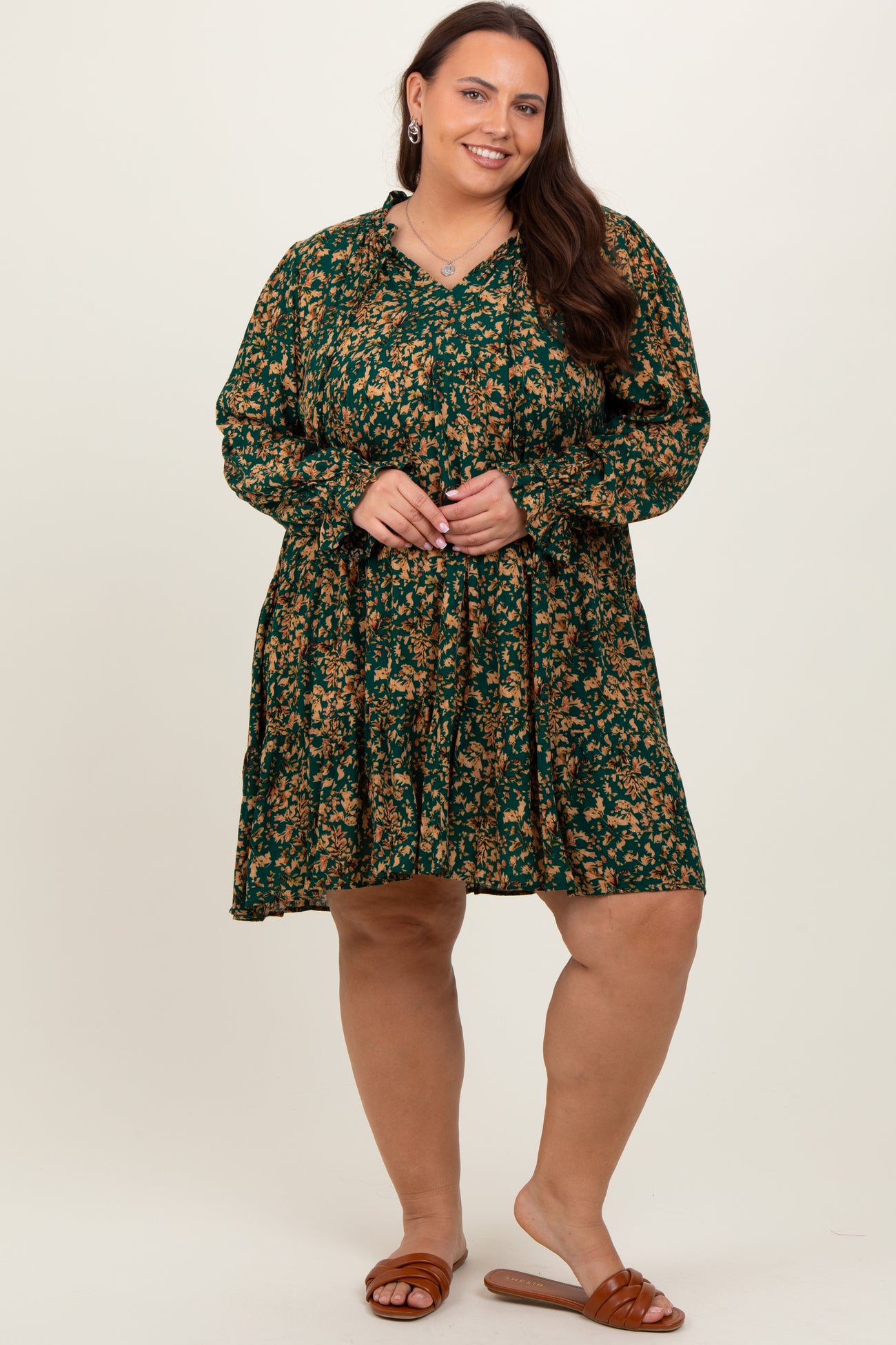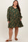 Forest Green Leaf Print Long Sleeve Plus Dress