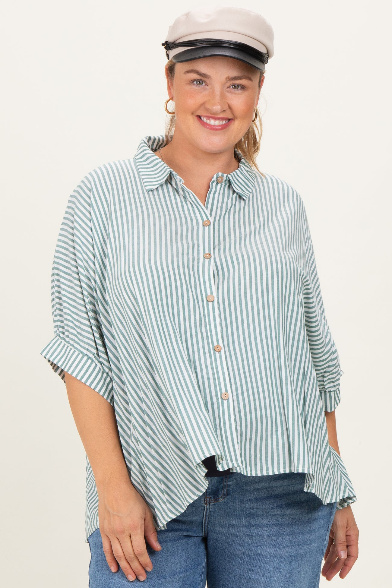 Forest Green Striped Button Up Short Dolman Sleeve Maternity Plus Top