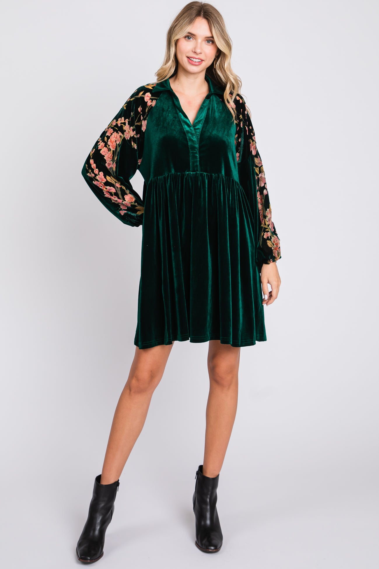 A velvet dress featuring floral burnout velvet long sleeves, a collar, a split v-neckline, and a slight hi-lo hem.