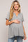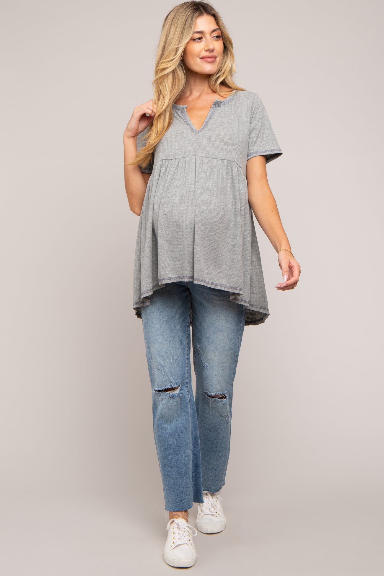 Details A solid maternity top with short sleeves, a v-neckline, and a hi-low hemline. Content + Care