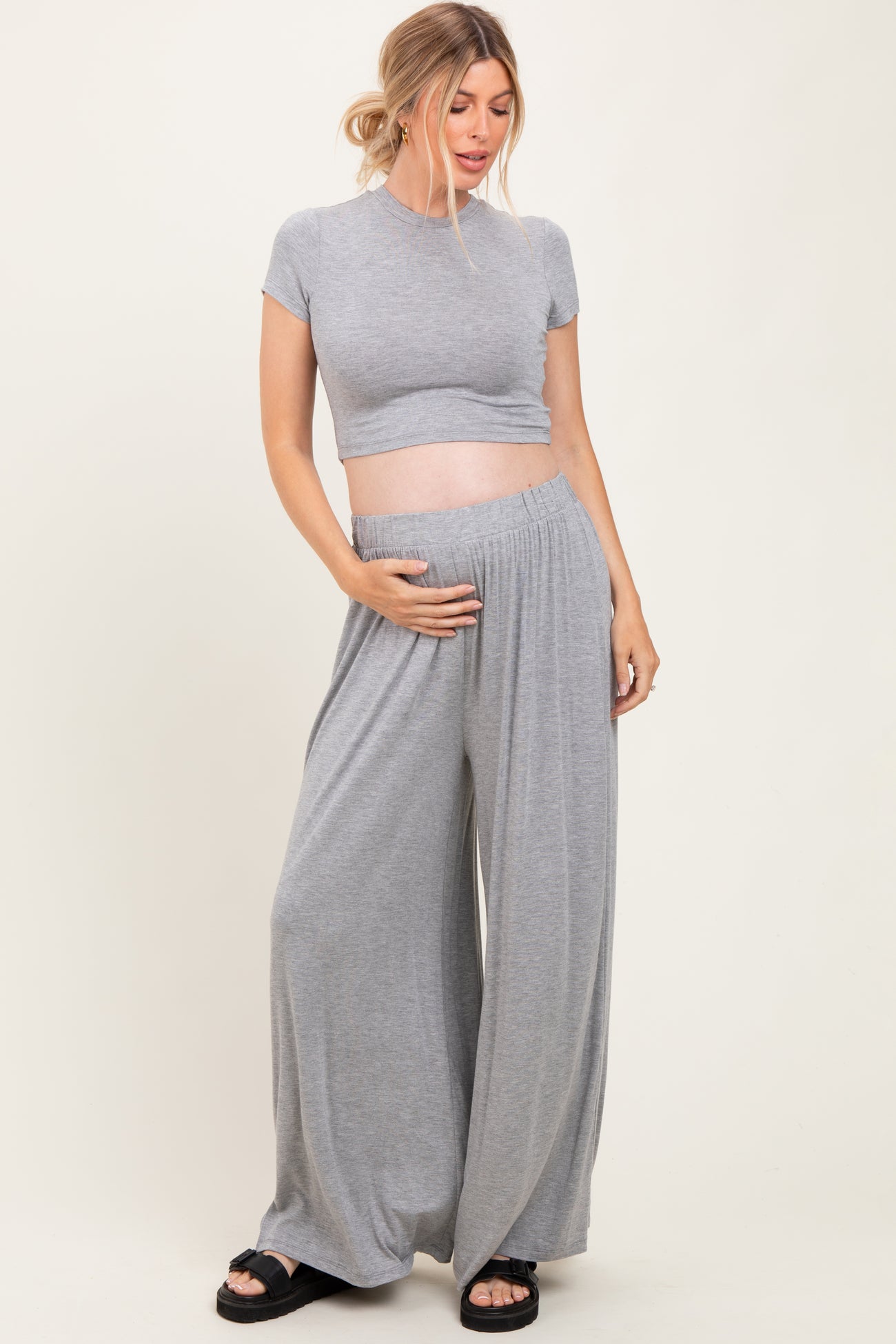 Heather Grey Cropped Short Sleeve Wide Leg Pants Maternity Set