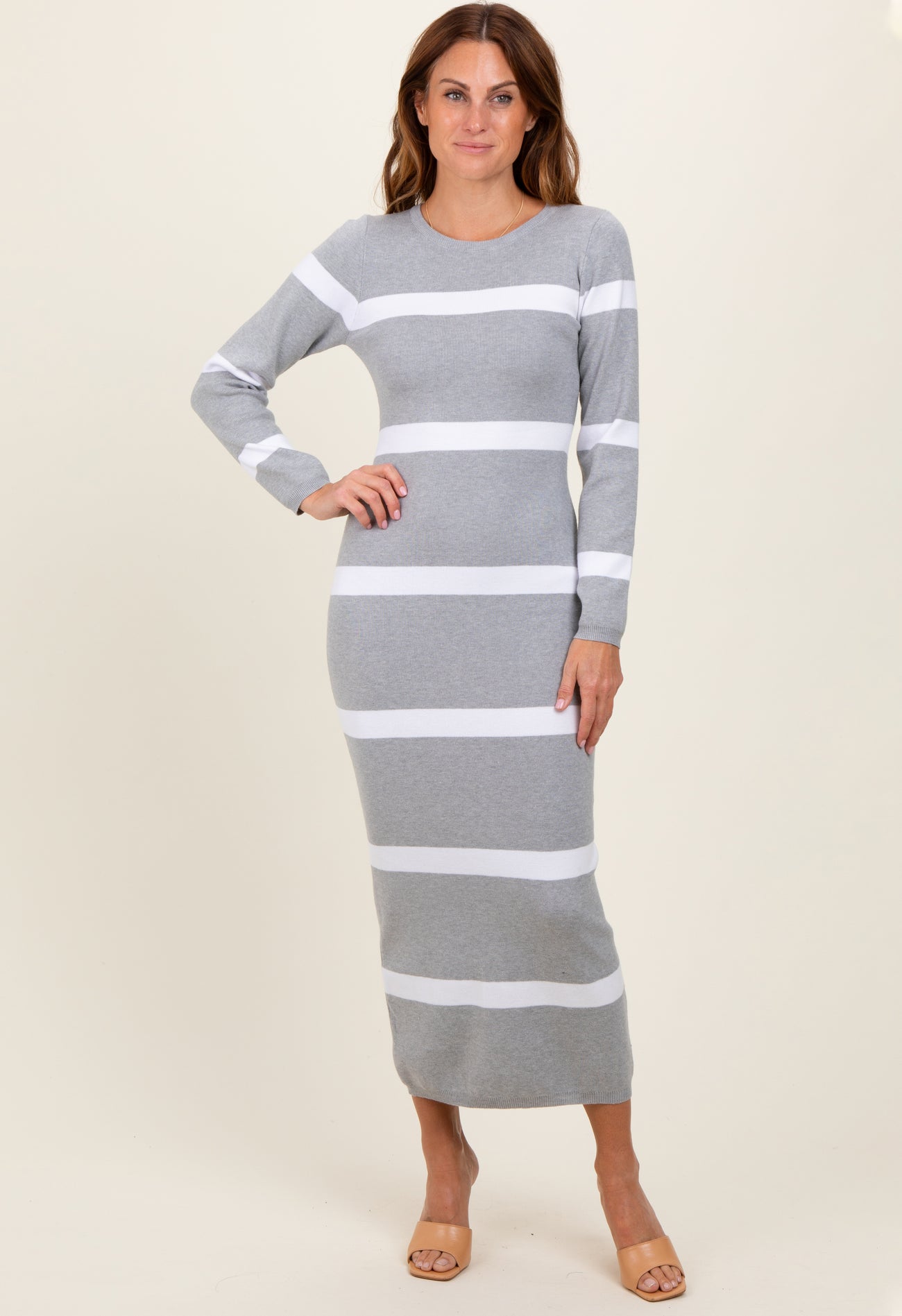 Heather Grey Striped Knit Long Sleeve Midi Sweater Dress