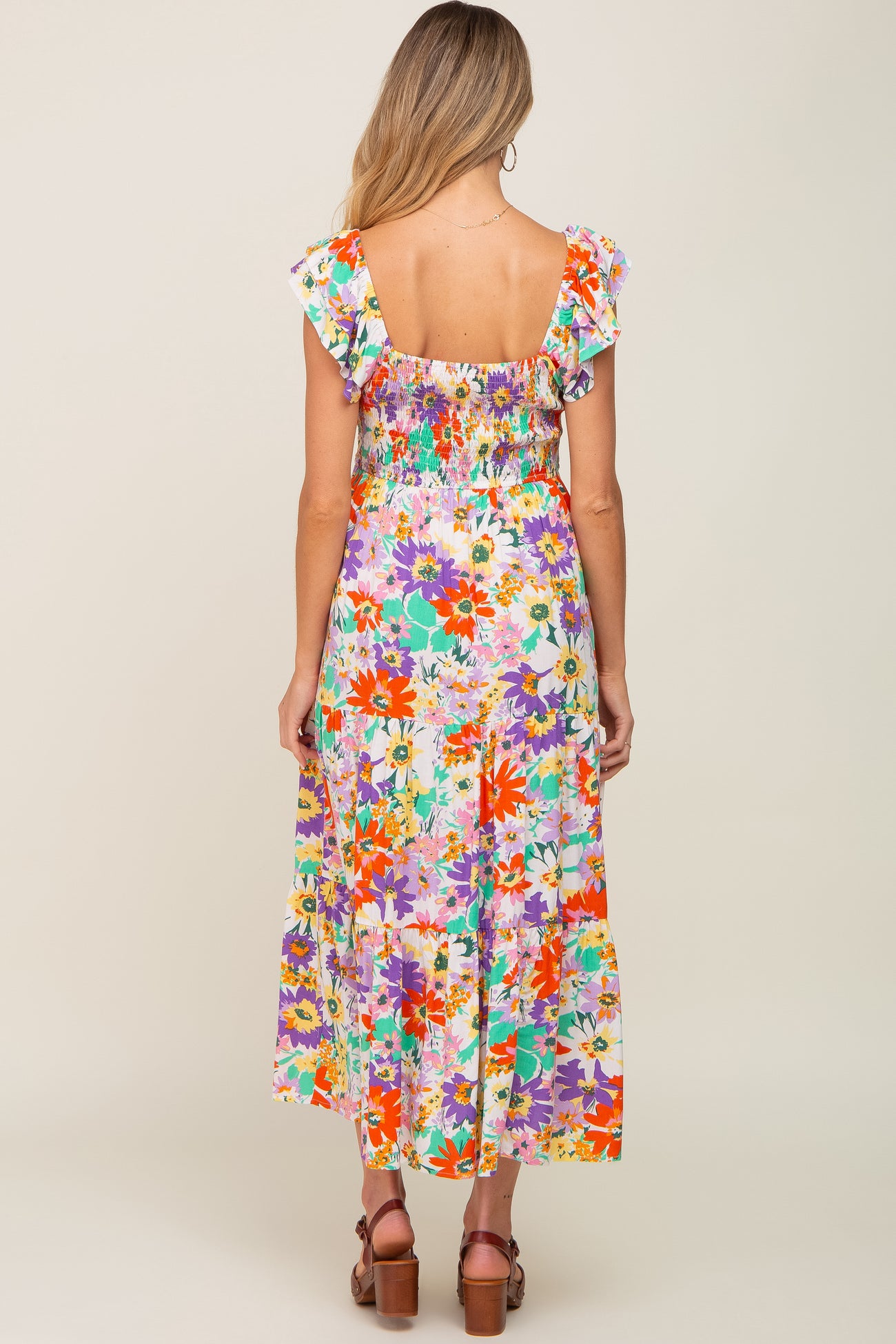 Ivory Floral Ruffle Strap Smocked Maternity Midi Dress