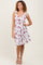 A floral sleeveless dress featuring knotted shoulder straps, a wrap v-neckline and an empire waist. Skirt is double lined.