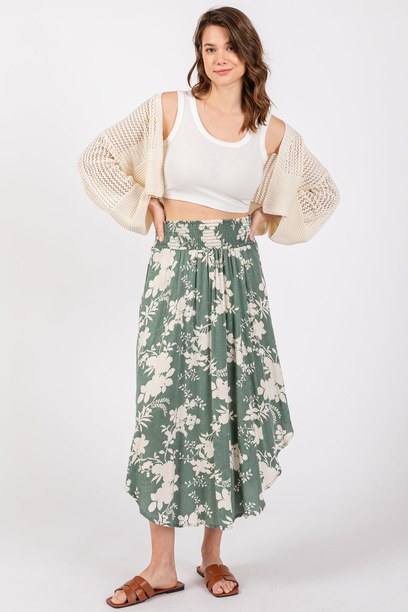 Jade Floral Embroidered Smocked Round Hem Midi Skirt