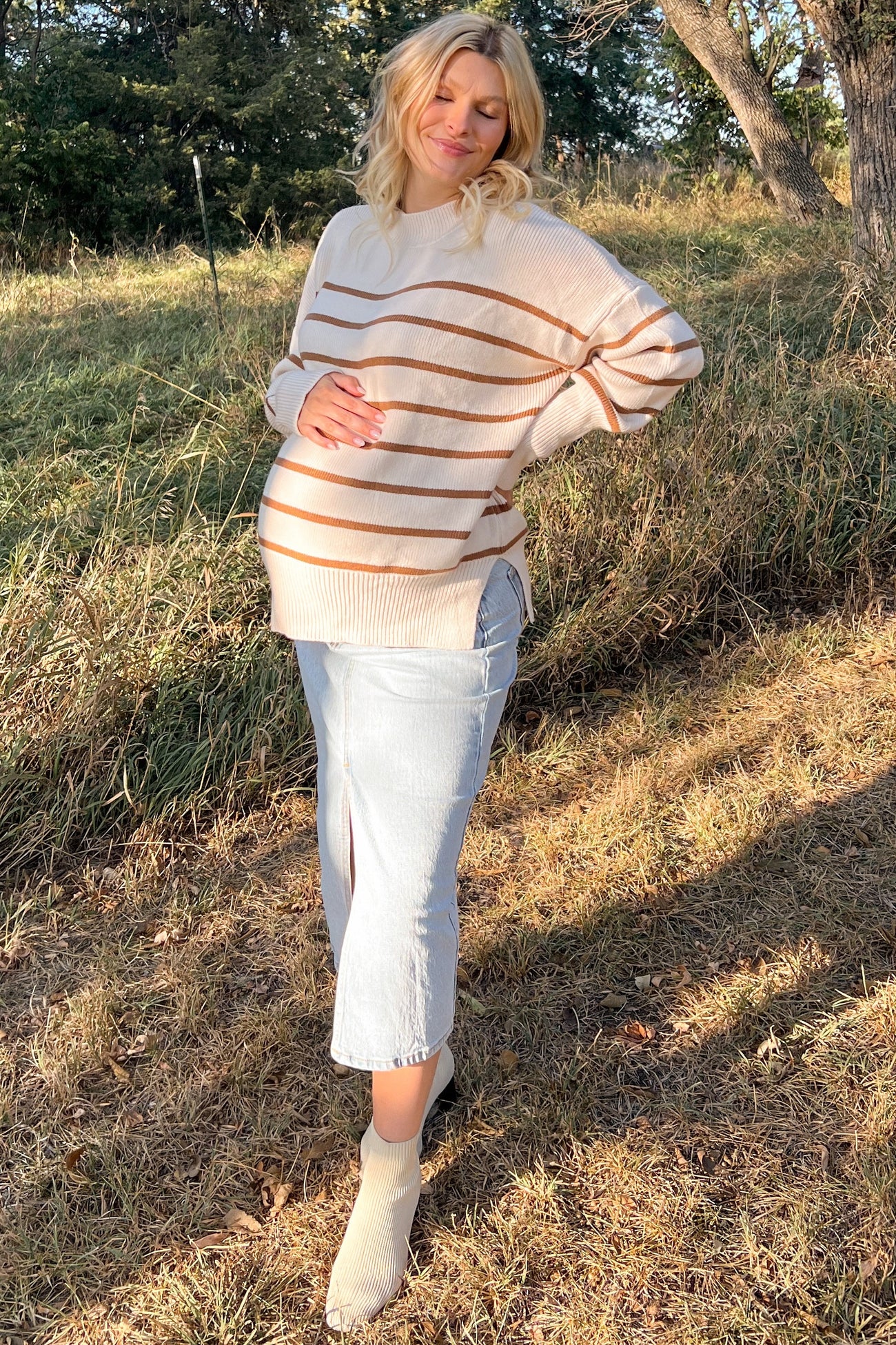 Light Blue Distressed Front Slit Maternity Midi Skirt