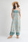 Light Blue Floral Border Print Smocked Shoulder Tie Jumpsuit
