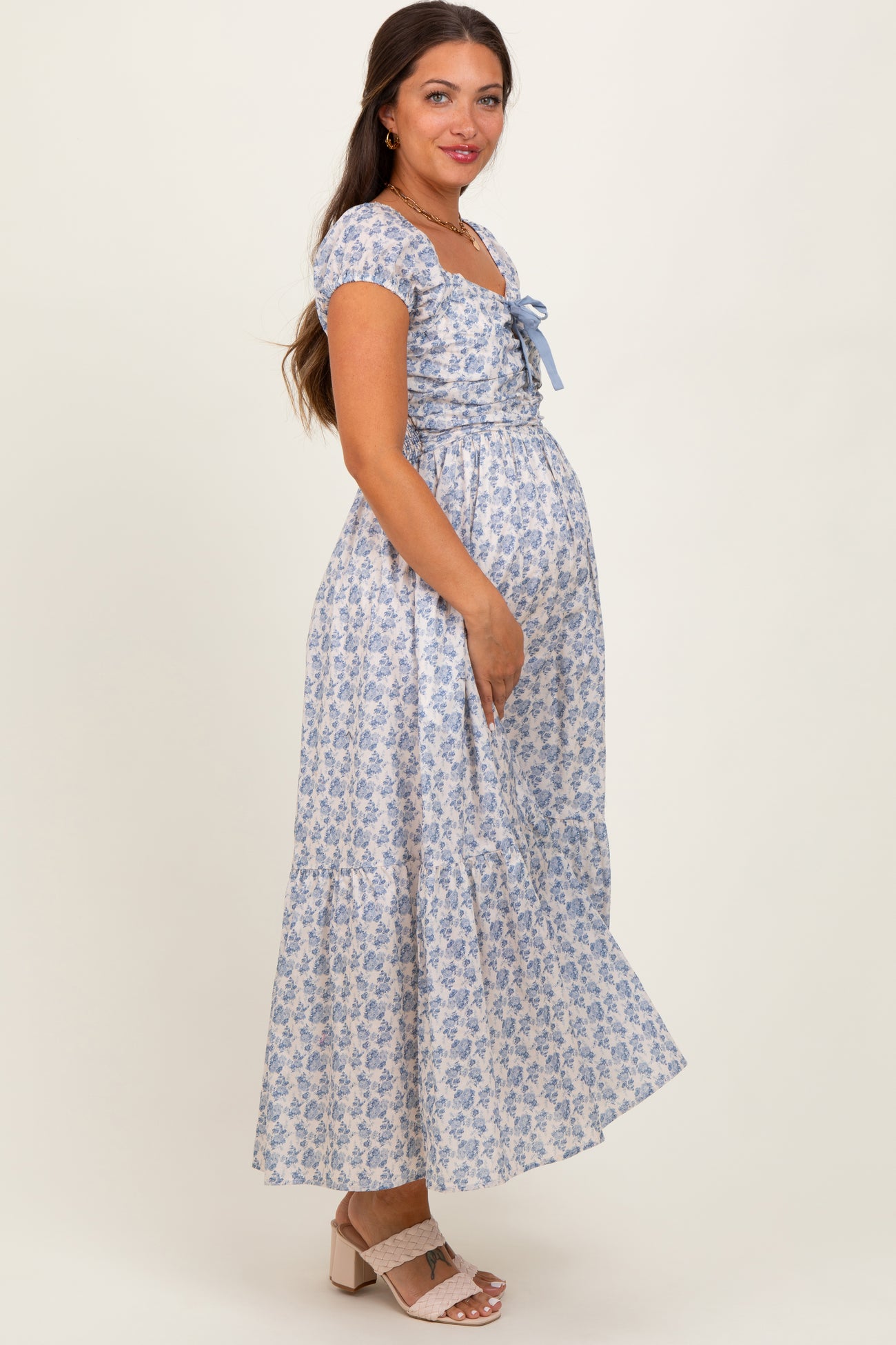 Light Blue Floral Ruched Bow Tie Floral Maternity Maxi Dress