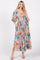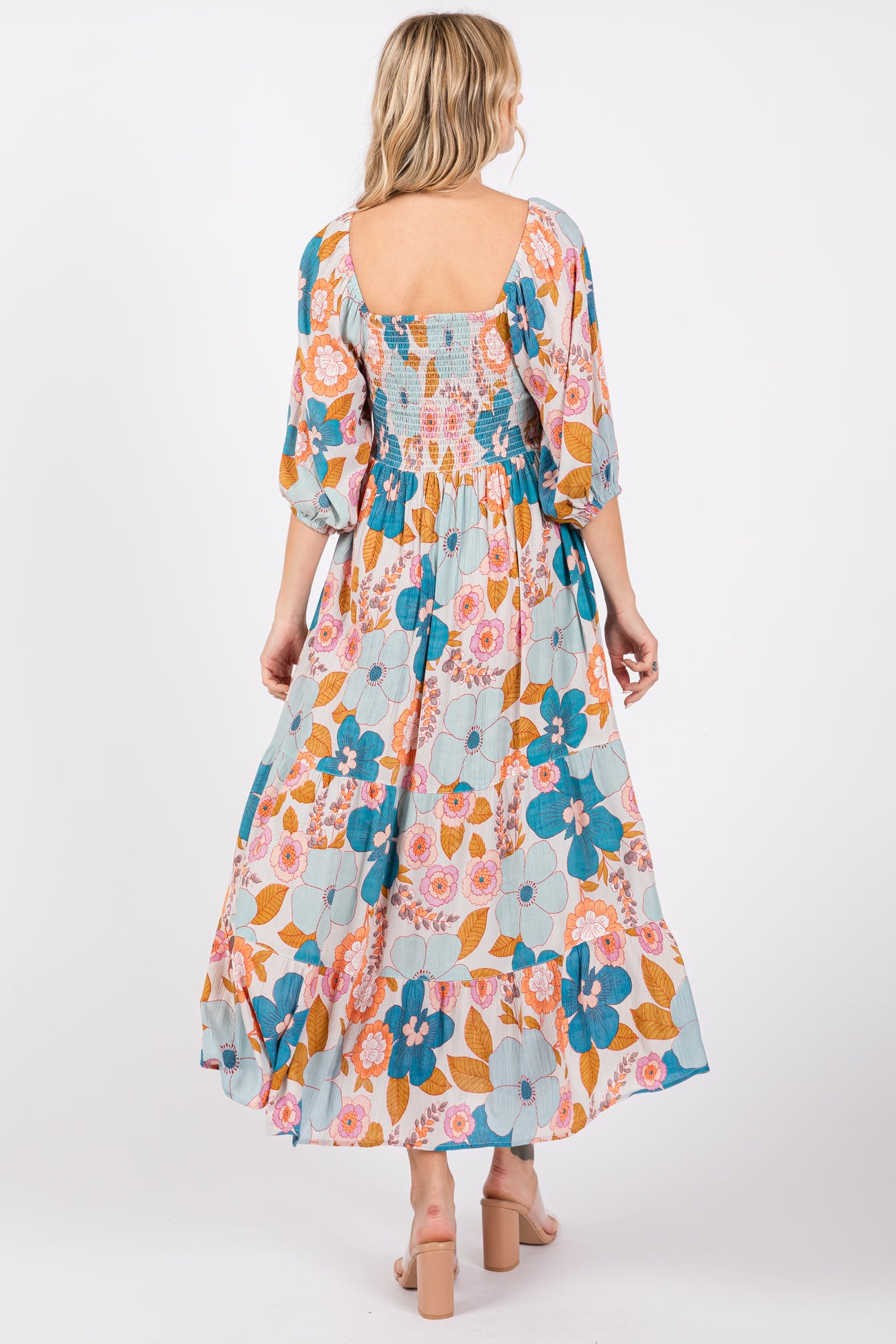 Light Blue Floral Smocked Square Neck Tiered Midi Dress