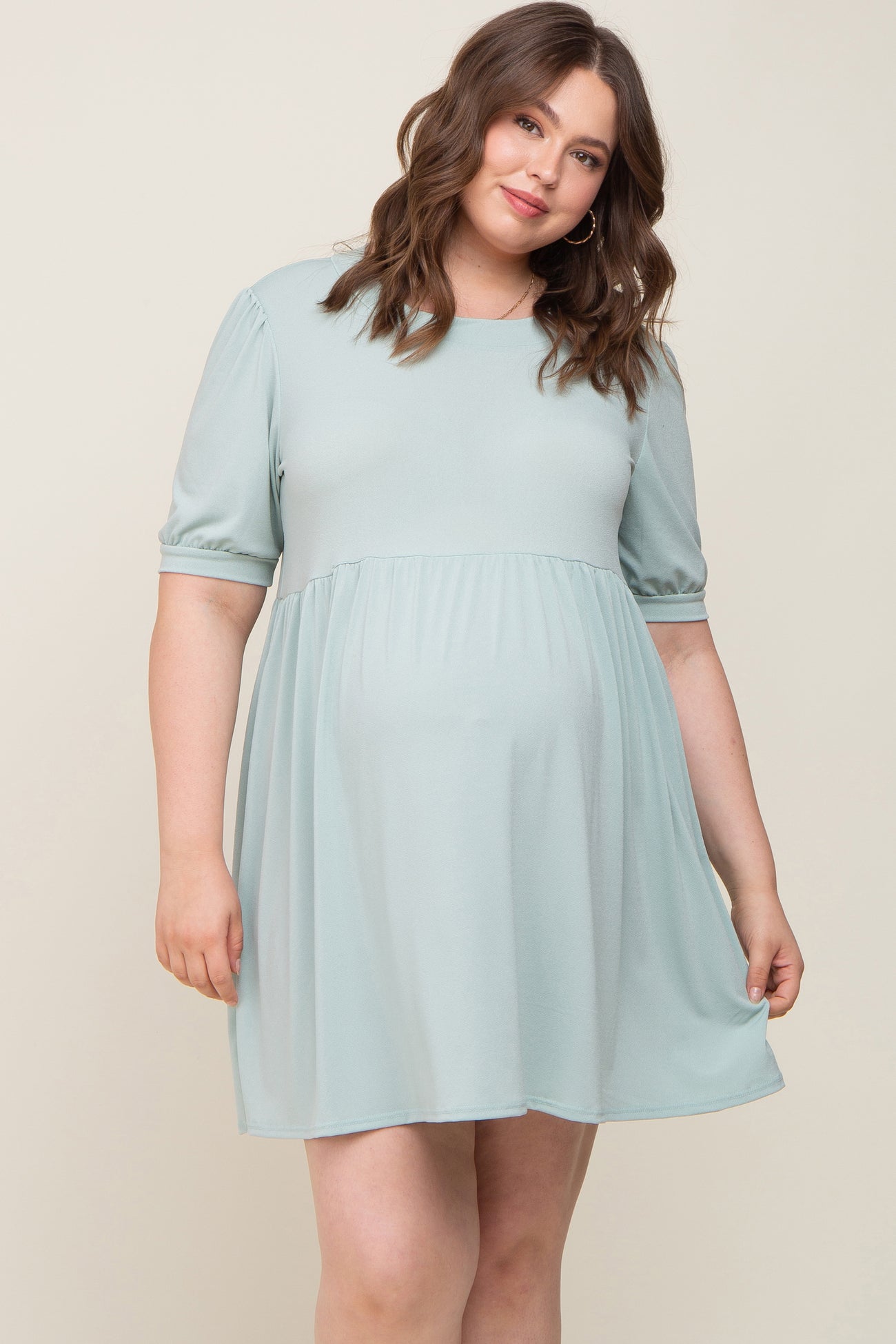 Details A solid hue maternity plus size dress featuring a rounded neckline, short puff sleeves, and an elastic waist. Content + Care