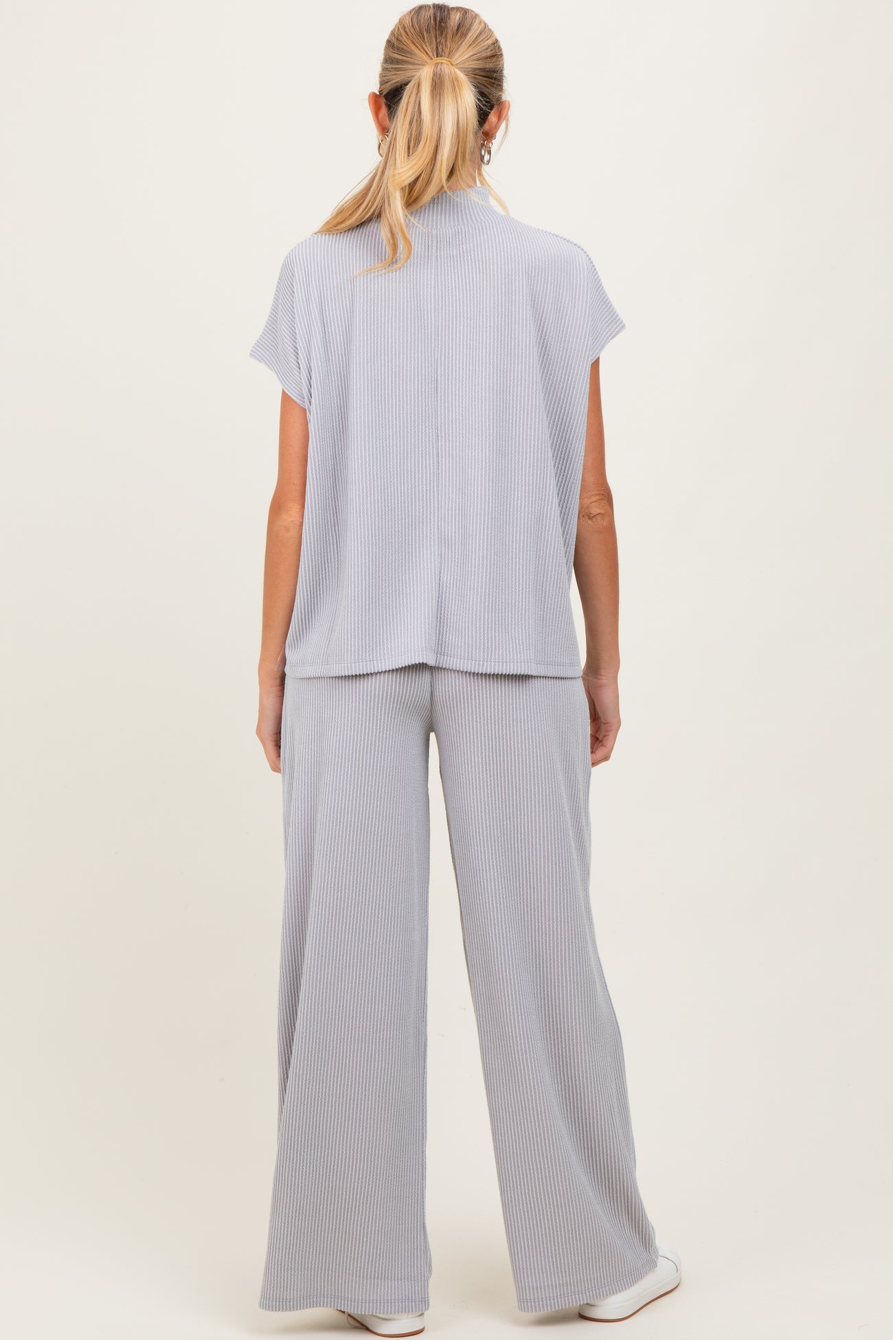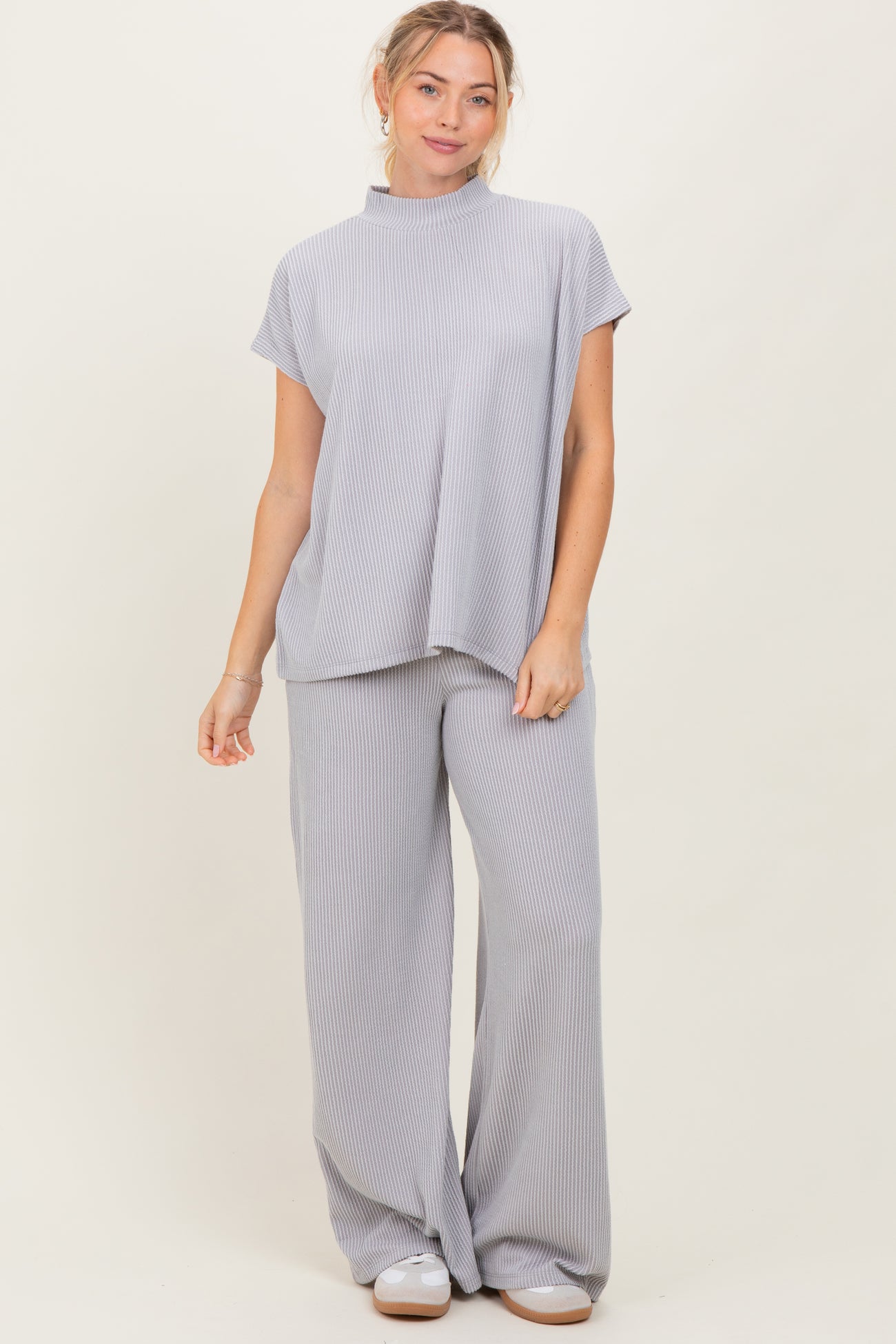 Light Grey Textured Rib Mock Neck Short Sleeve Pant Maternity Set