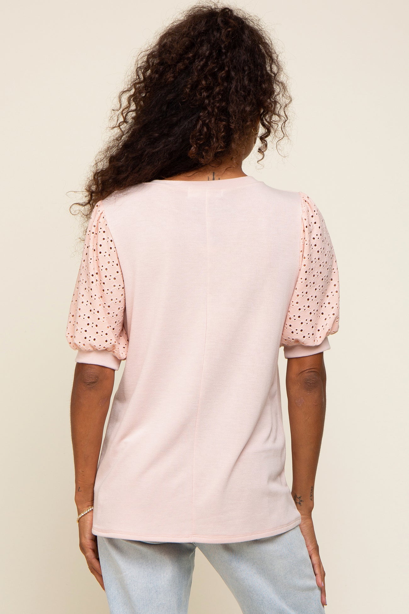 Details A solid hued top featuring short eyelet lace puff sleeves and a rounded neckline. Content + Care